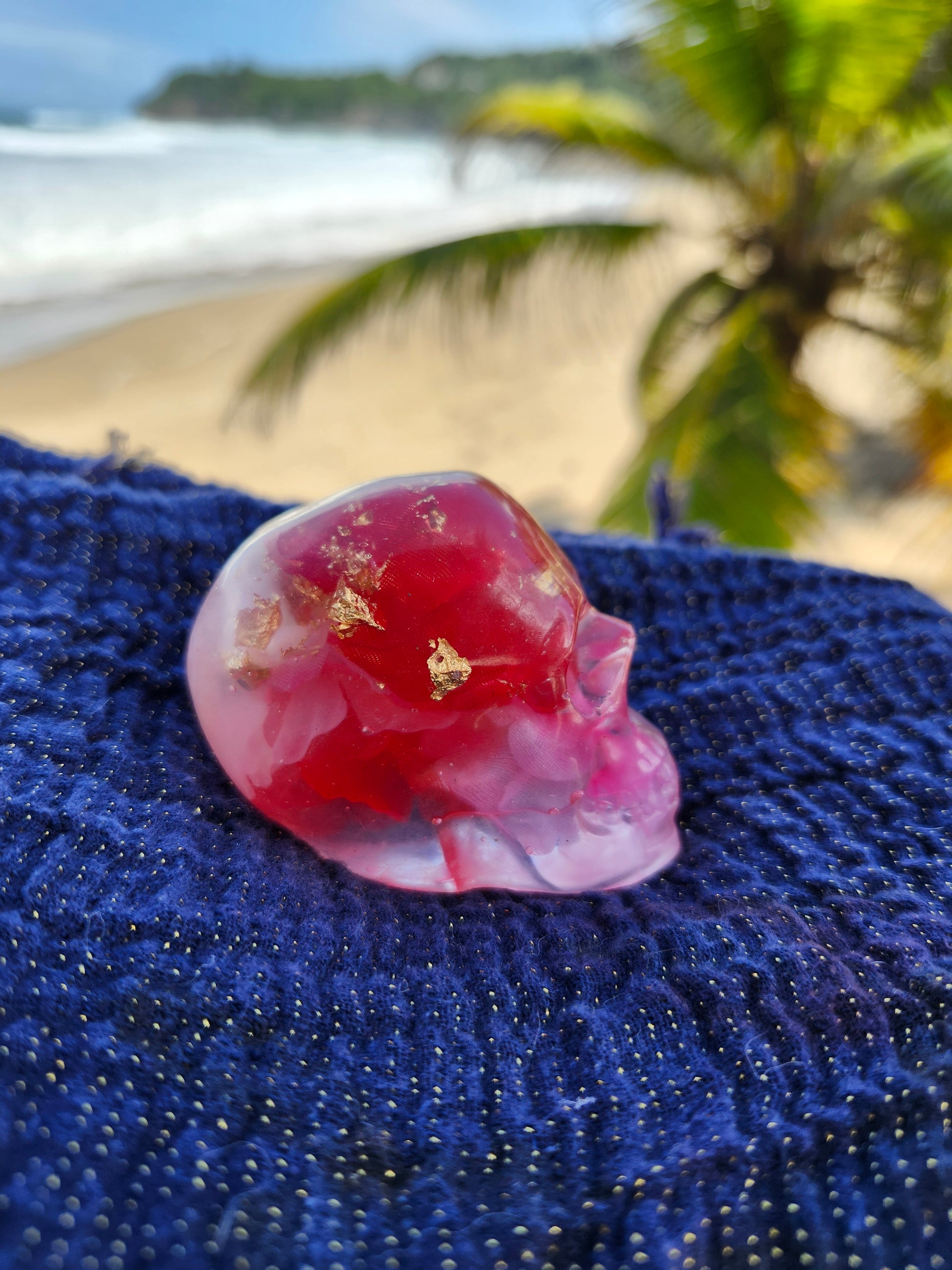 Calavera mediana en resina, creada a mano con flores de tela y pedacitos de oro.