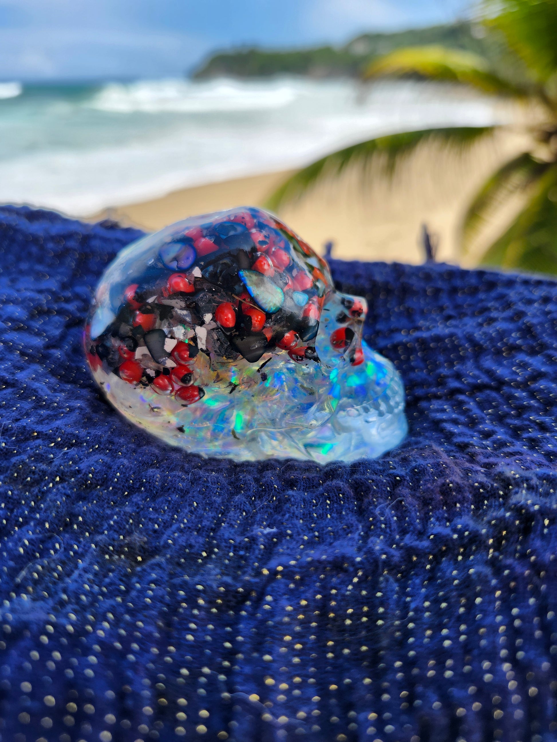 Calavera mediana en resina, creada a mano con semillas de pelonías y papel horográfico.