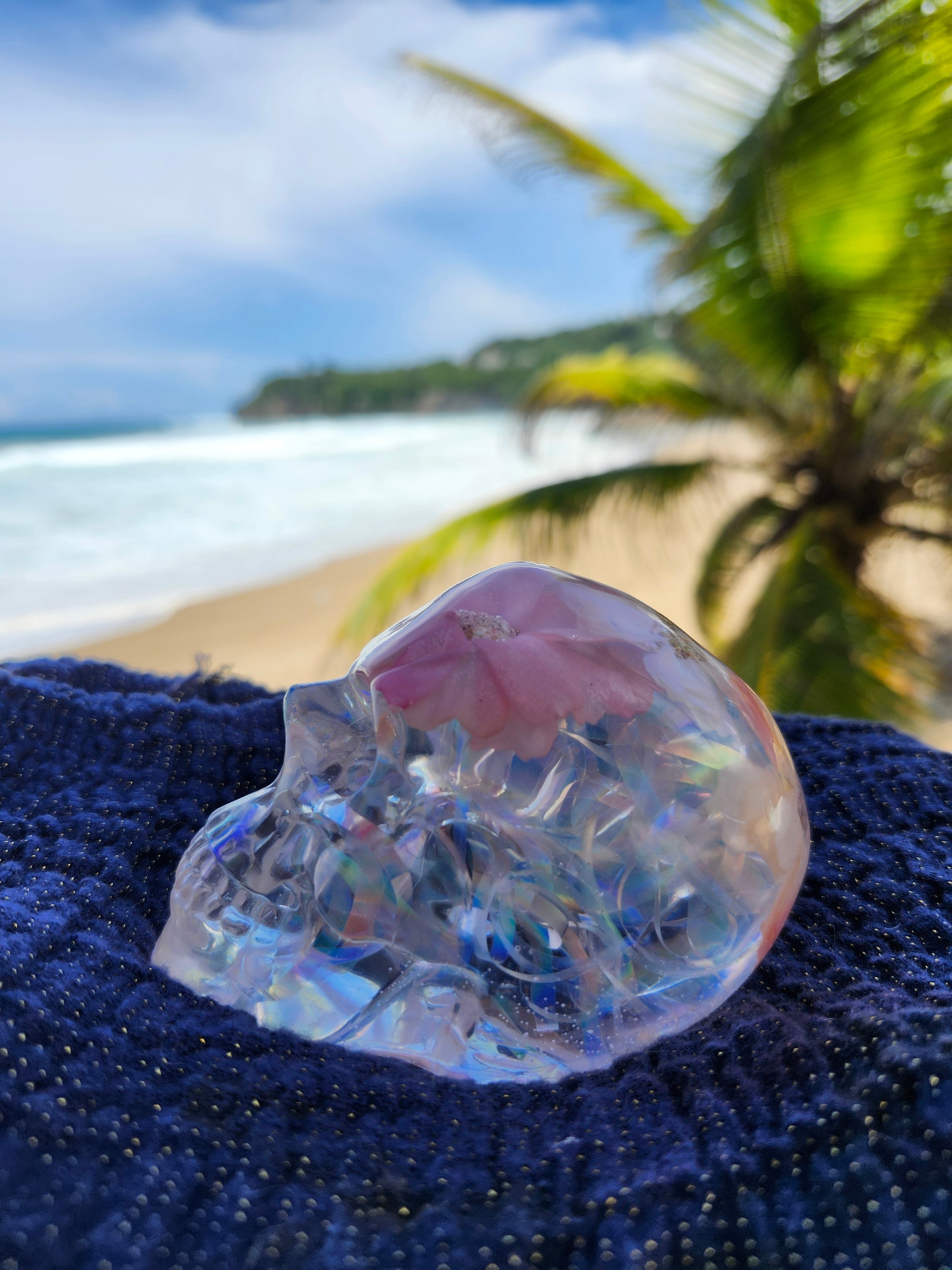 Calavera grande en resina, creada a mano con flores y papel horográfico.