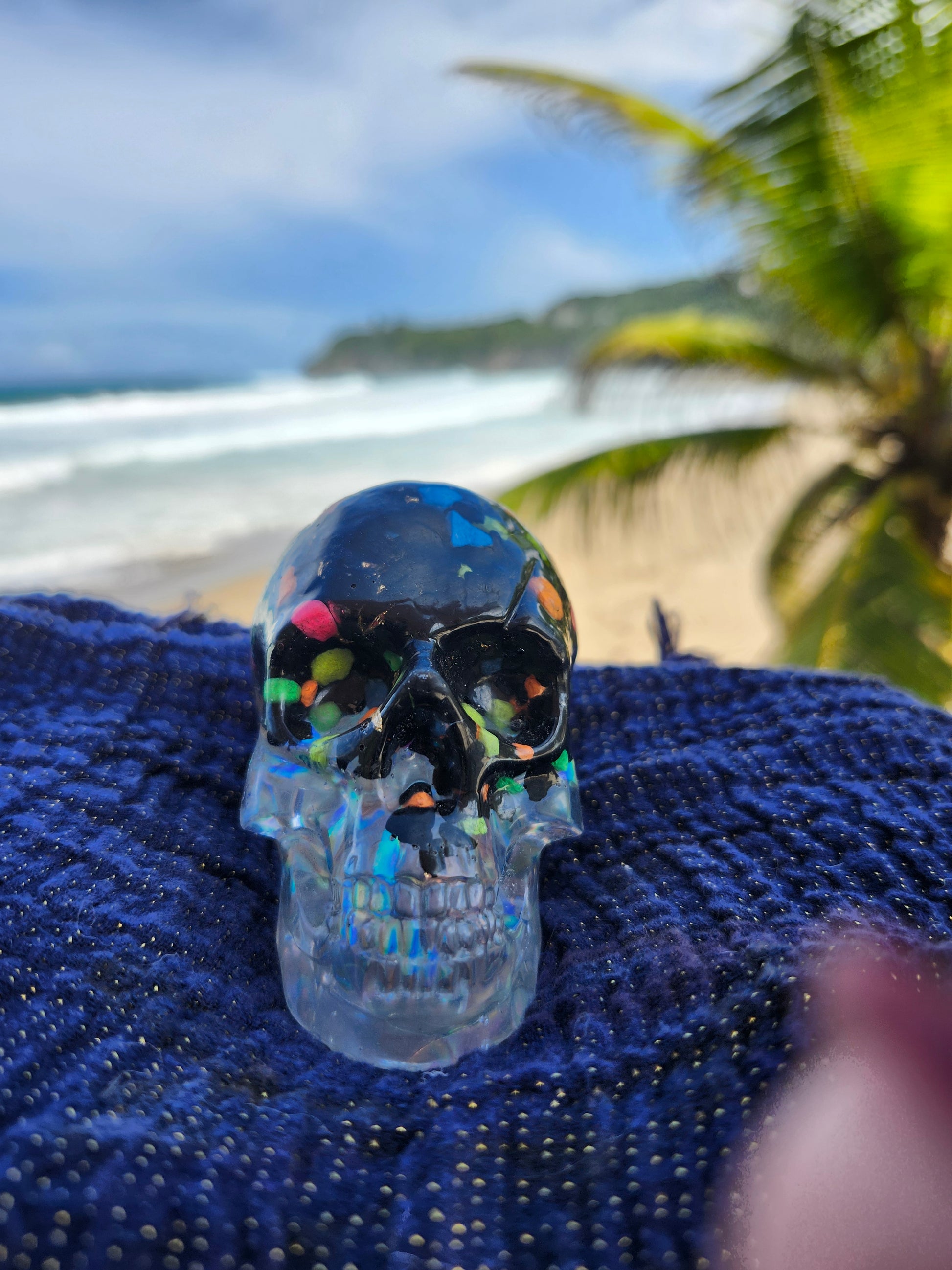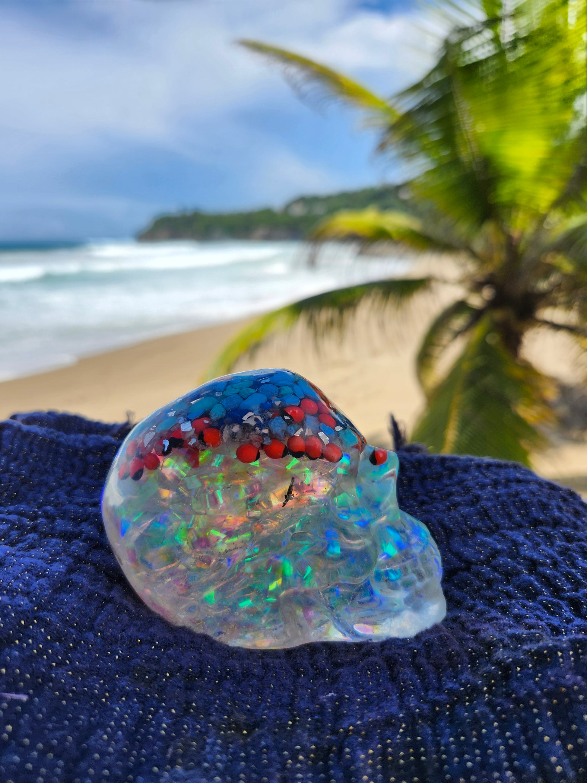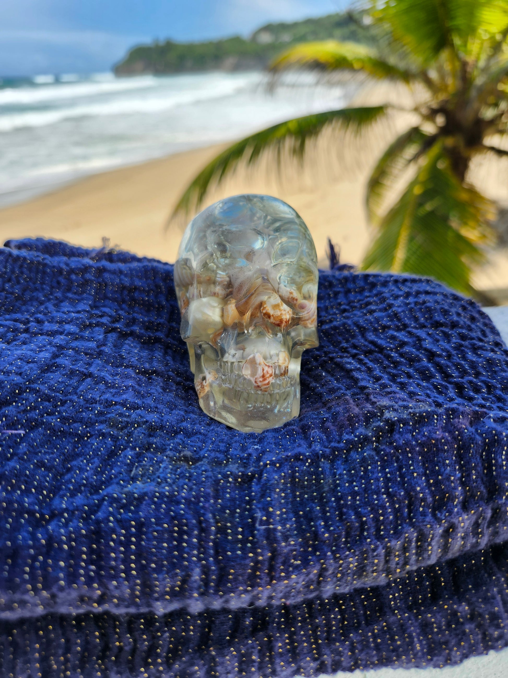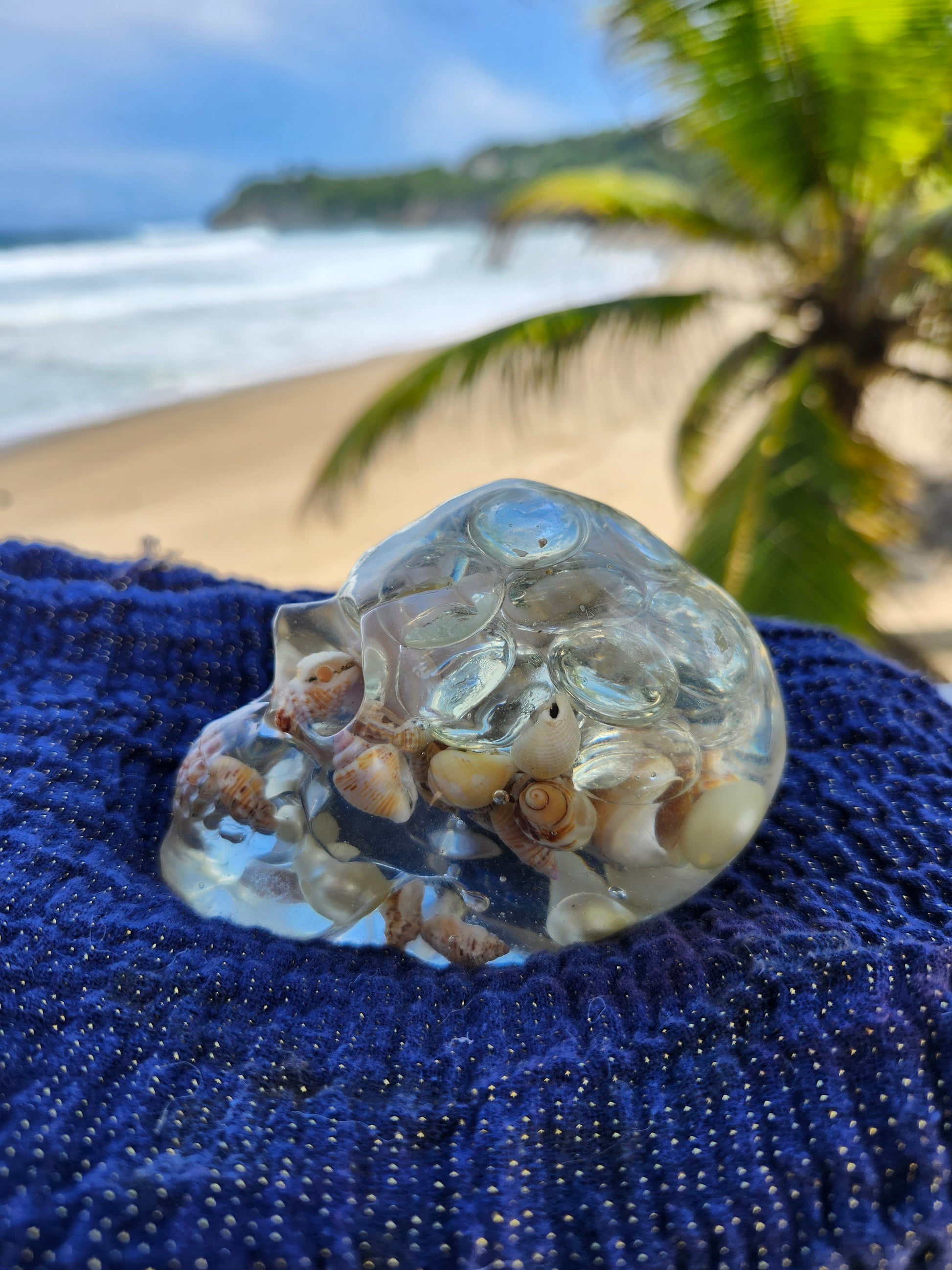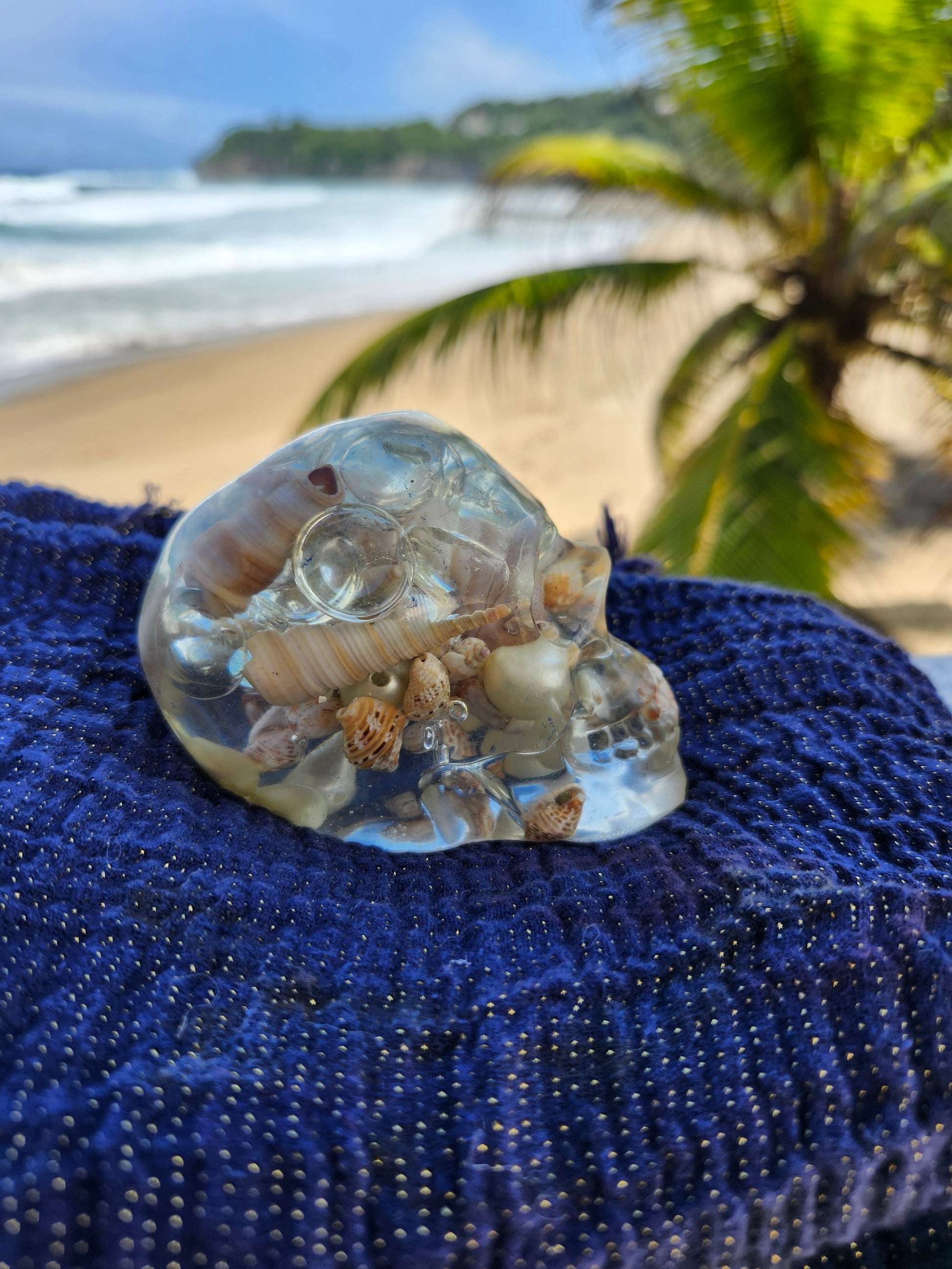 Calaveras medianas en resina, creadas a mano con elementos naturales de Puerto Rico como arena, caracoles y piedras. Cada pieza es única, fusionando tradición y encanto caribeño en un diseño artístico y original. Ideales para decoración, coleccionistas o regalos especiales que capturan la esencia tropical en un detalle distintivo.