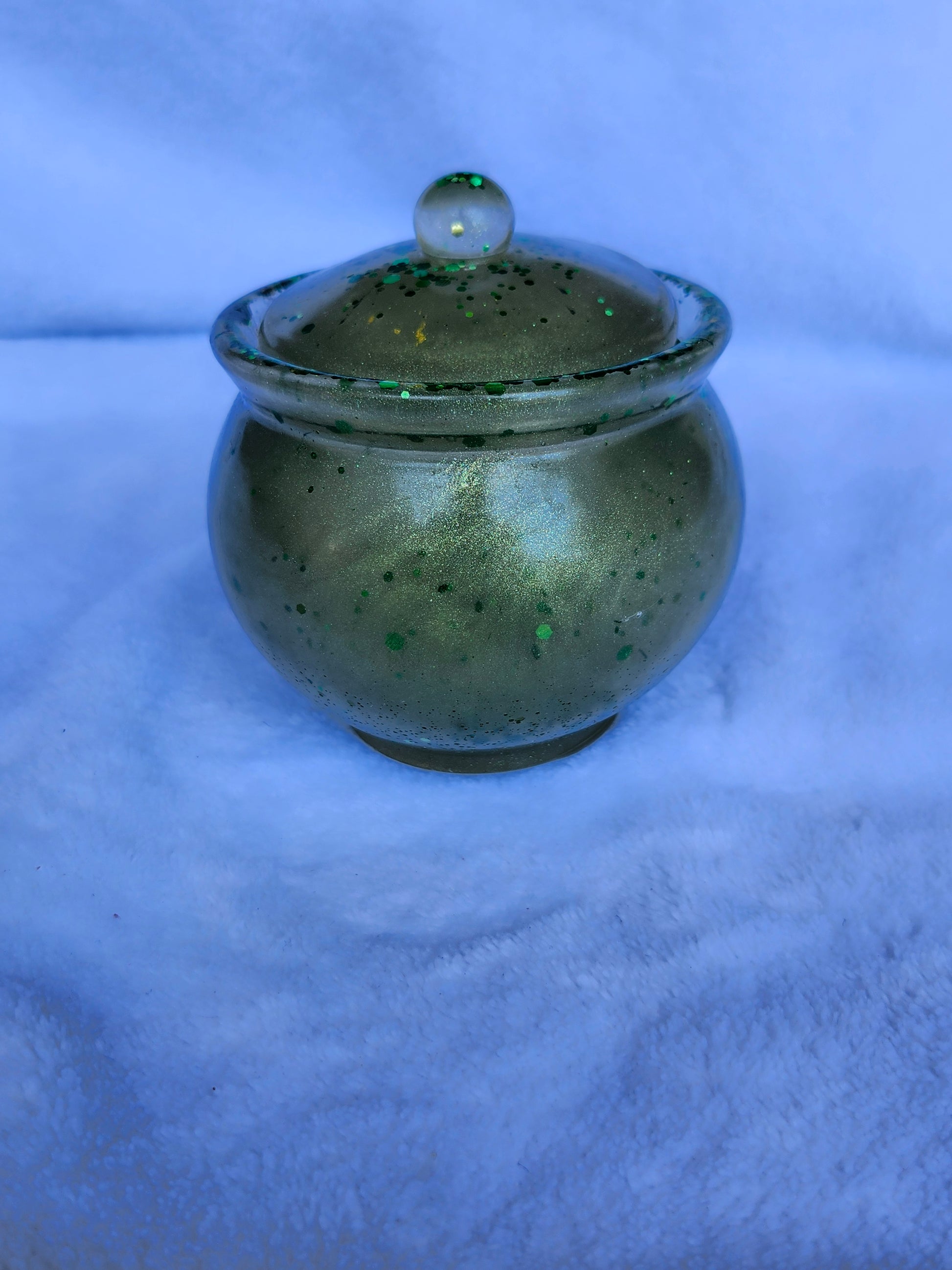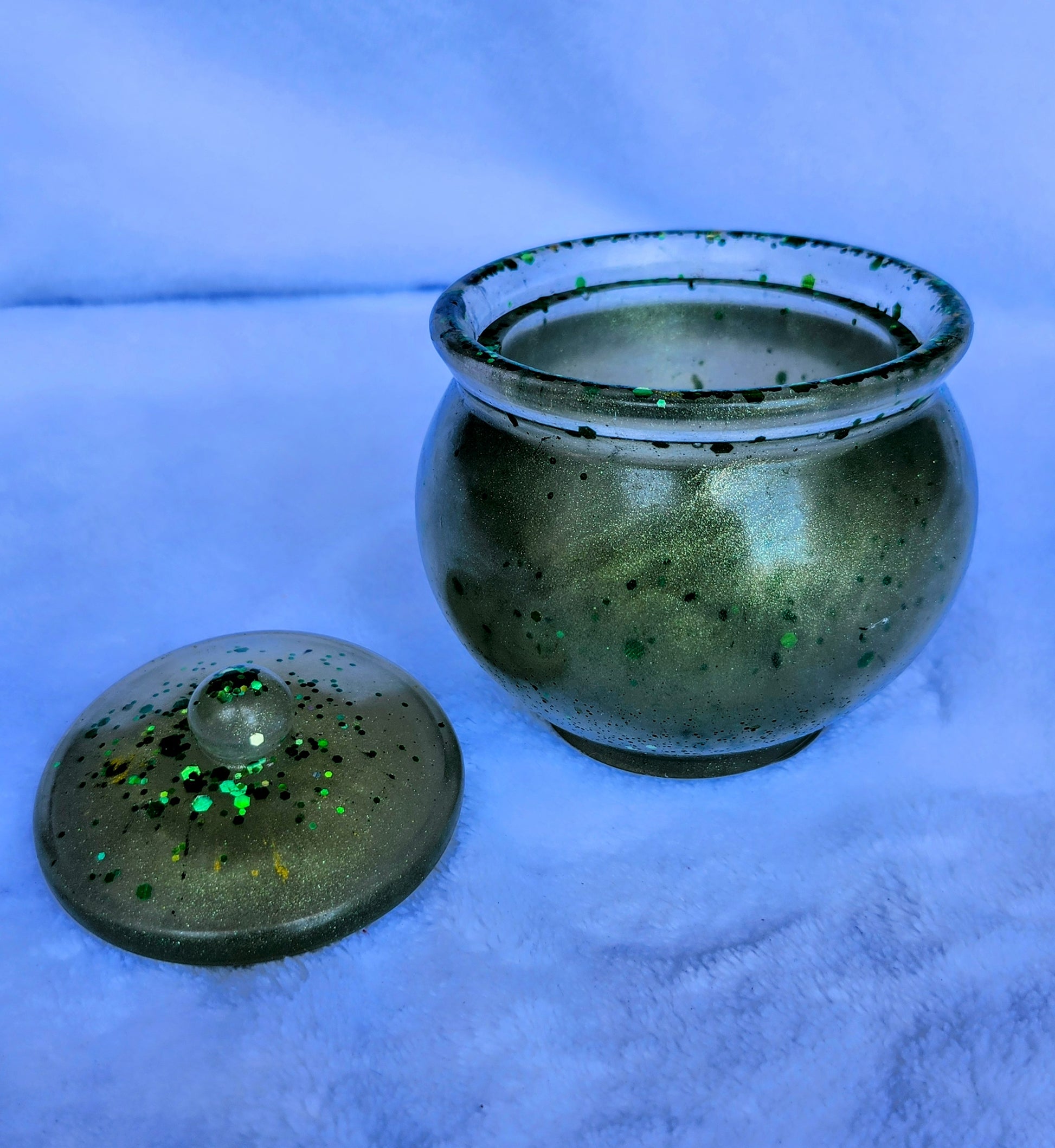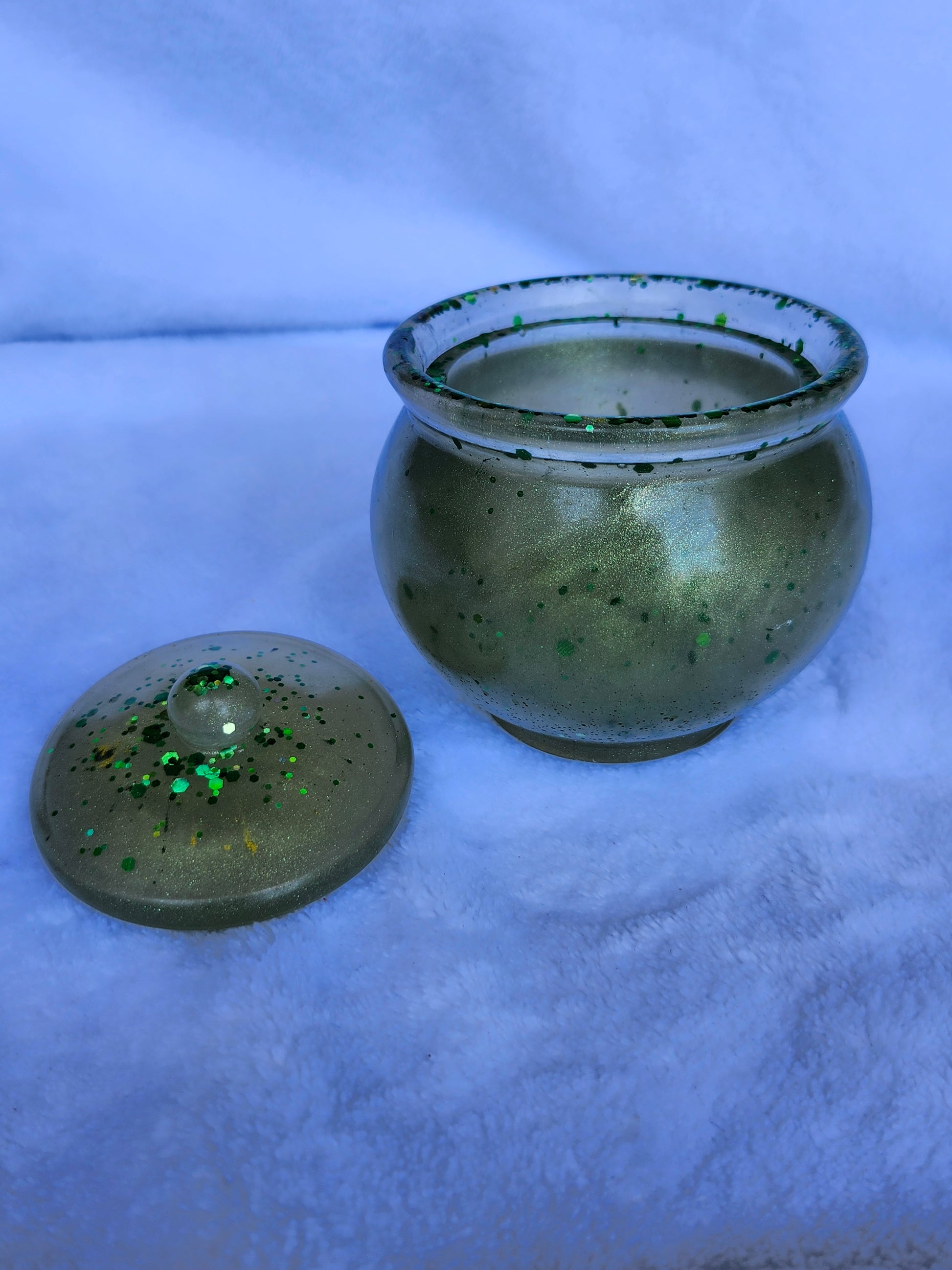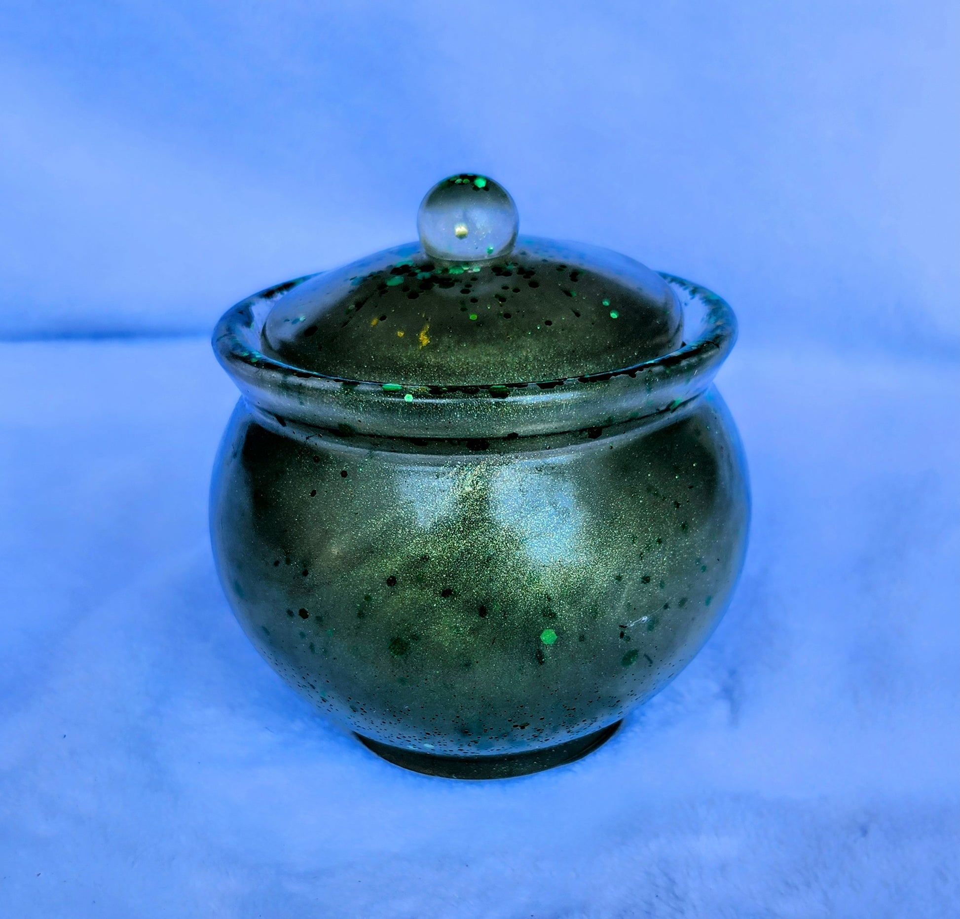 Este caldero cofre hecho a mano es una pieza mágica. Elaborado con resina epoxi de alta calidad, simula una olla antigua con detalles intrincados. Perfecto para guardar tus joyas, cristales o tesoros más preciados. ¡Añade un toque místico y único a cualquier espacio!