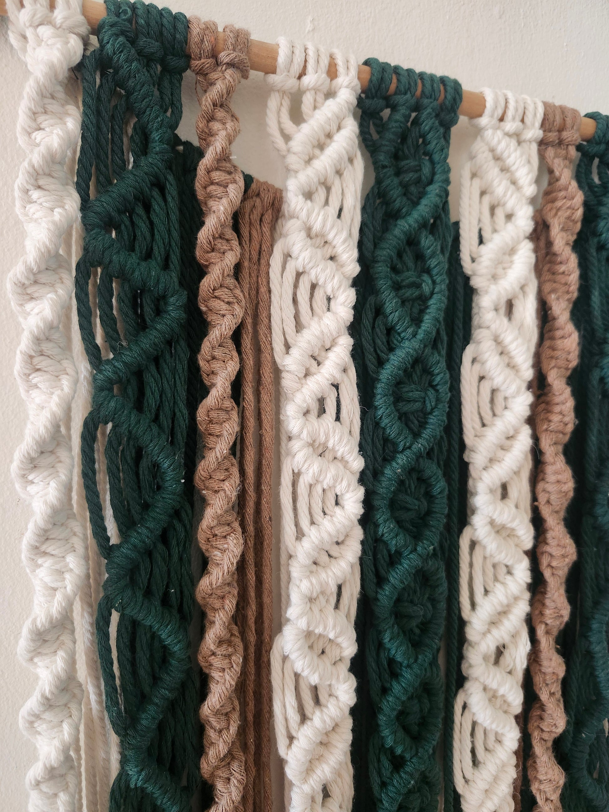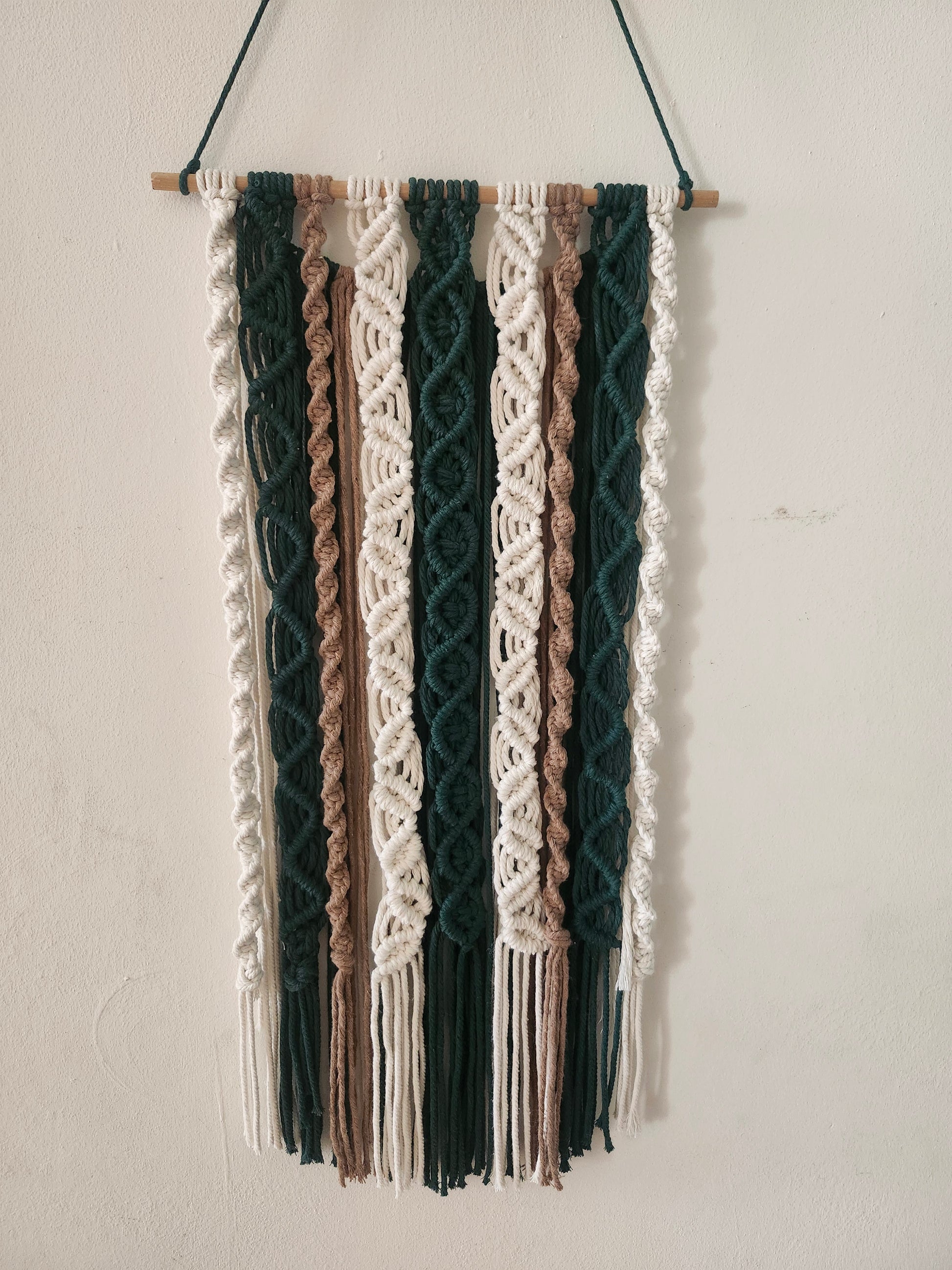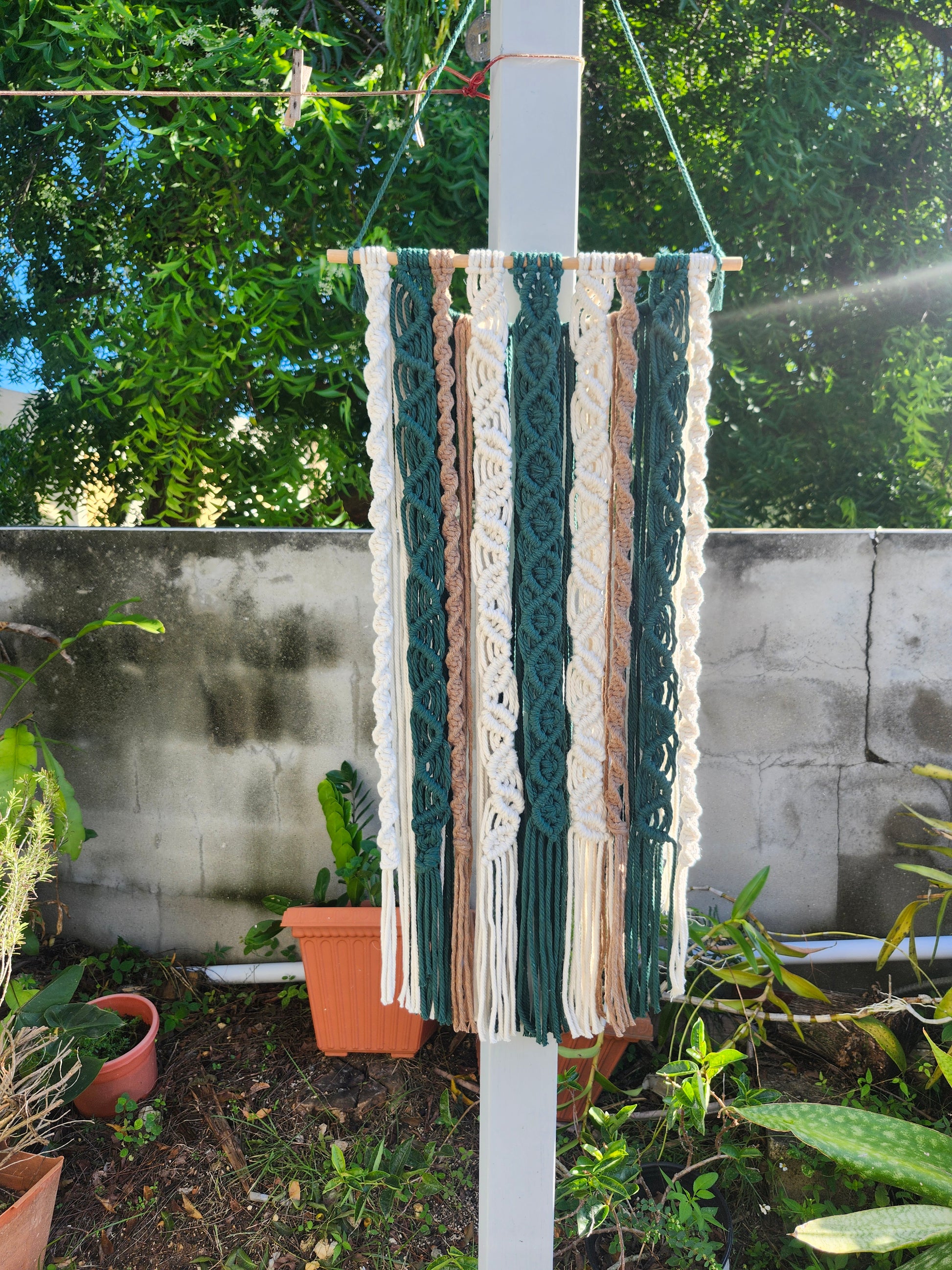 Elegante colgante de macramé hecho a mano en algodón orgánico, tamaño 15” x 35”. Sus tonos tierra y verdes evocan la naturaleza, aportando calidez y armonía a cualquier espacio. Ideal para decorar salas, dormitorios u oficinas, ofreciendo un estilo boho artesanal y sostenible con un toque único y auténtico.