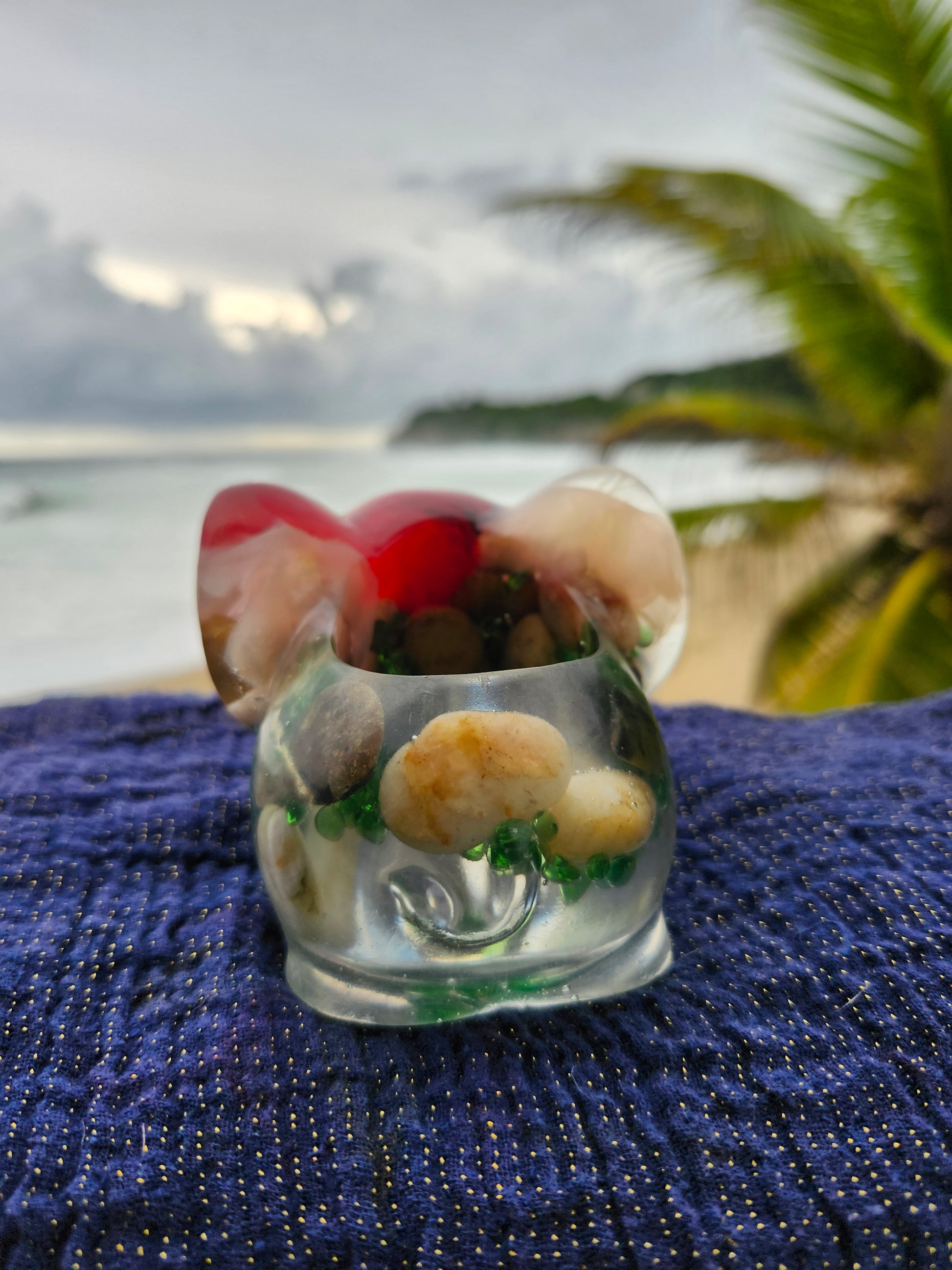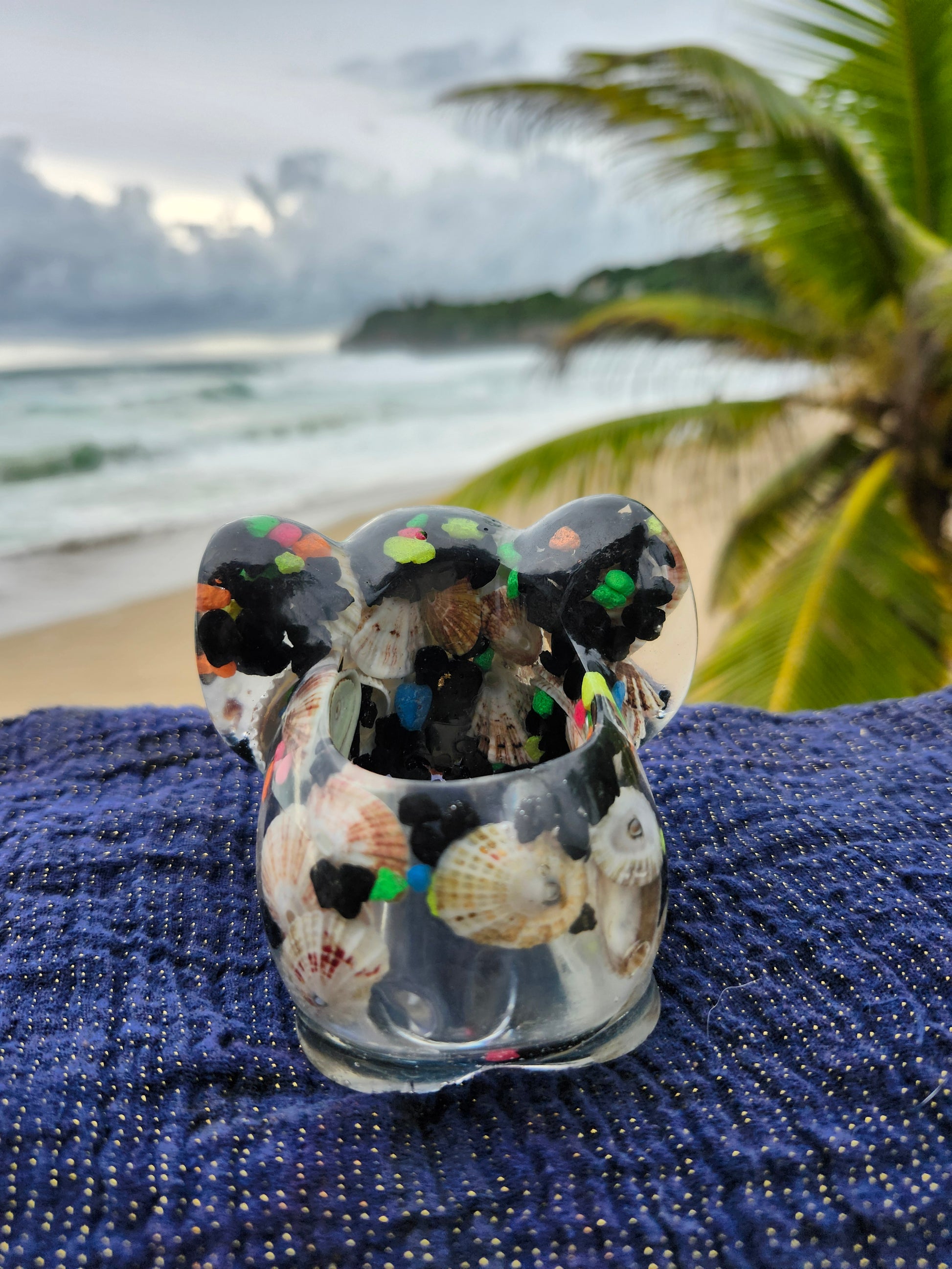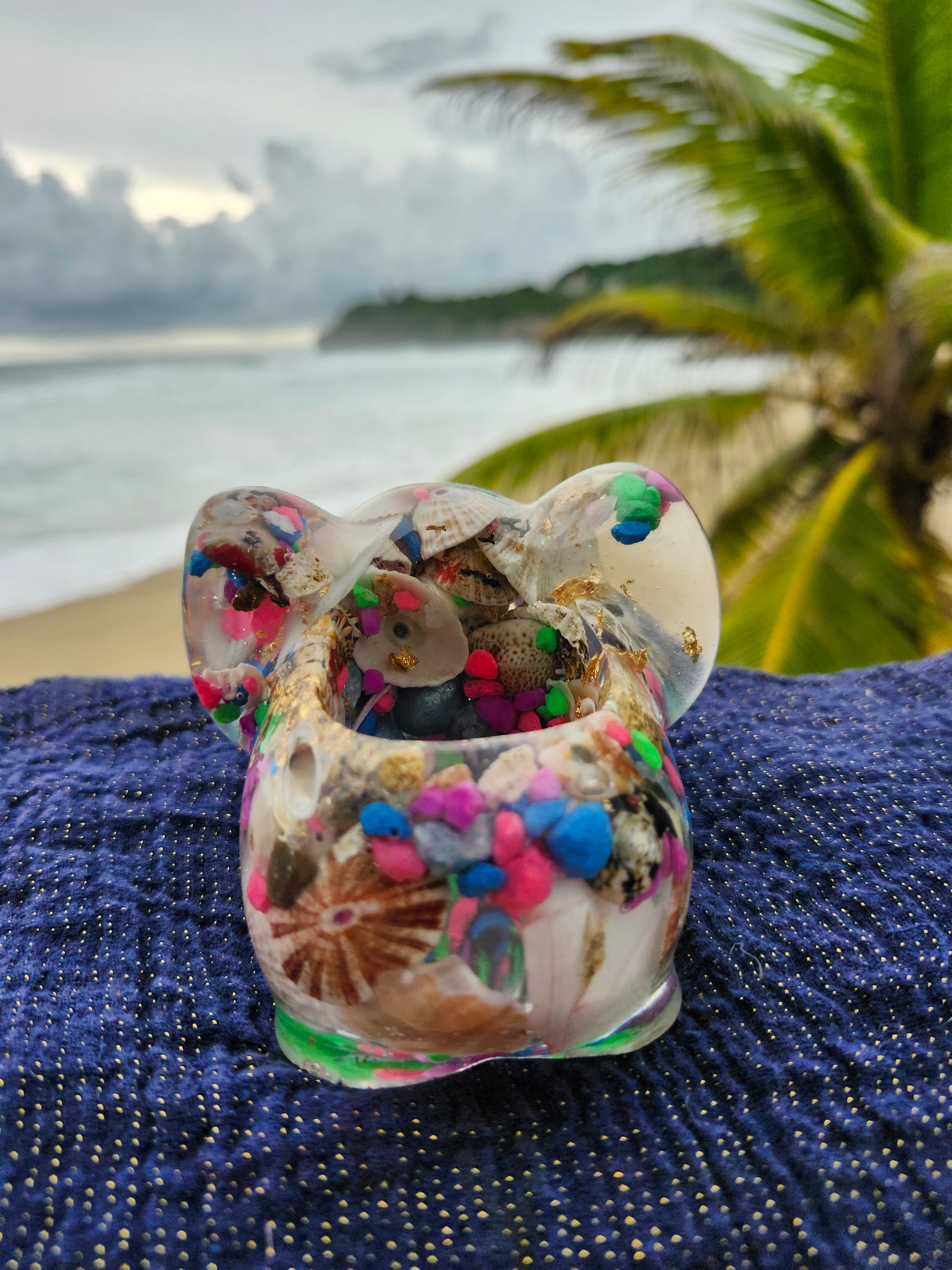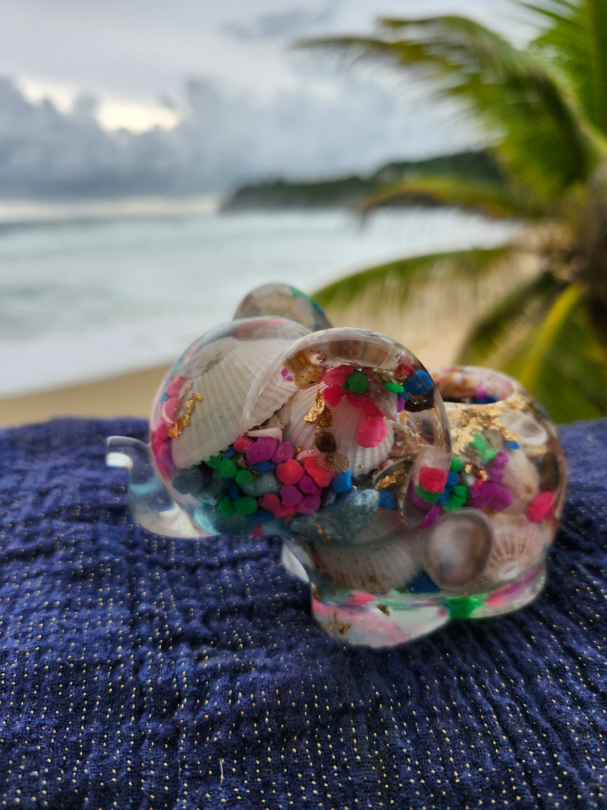 Elefante multiuso de resina: joyero, cenicero o candelabro. Pequeña obra de arte artesanal que captura la esencia de Puerto Rico. Cada pieza única está incrustada con arena de playa, micro-conchas o flores secas de la isla, creando un tesoro funcional con un toque del encanto boricua perfecto para tu hogar.
