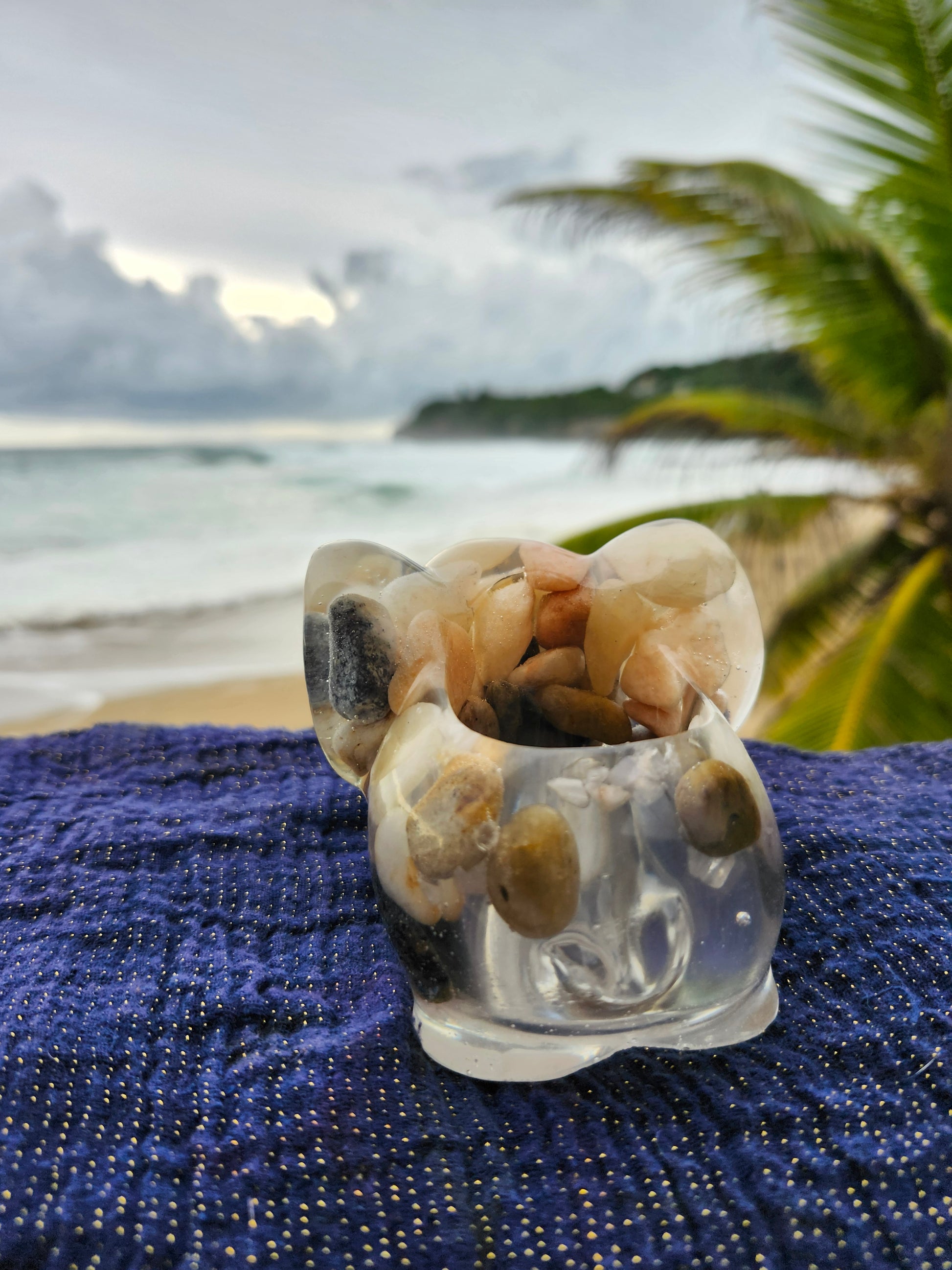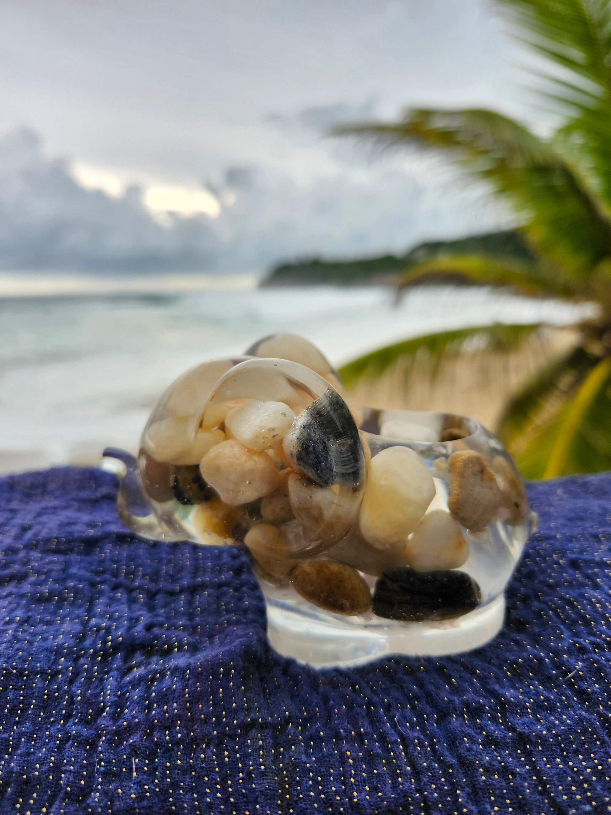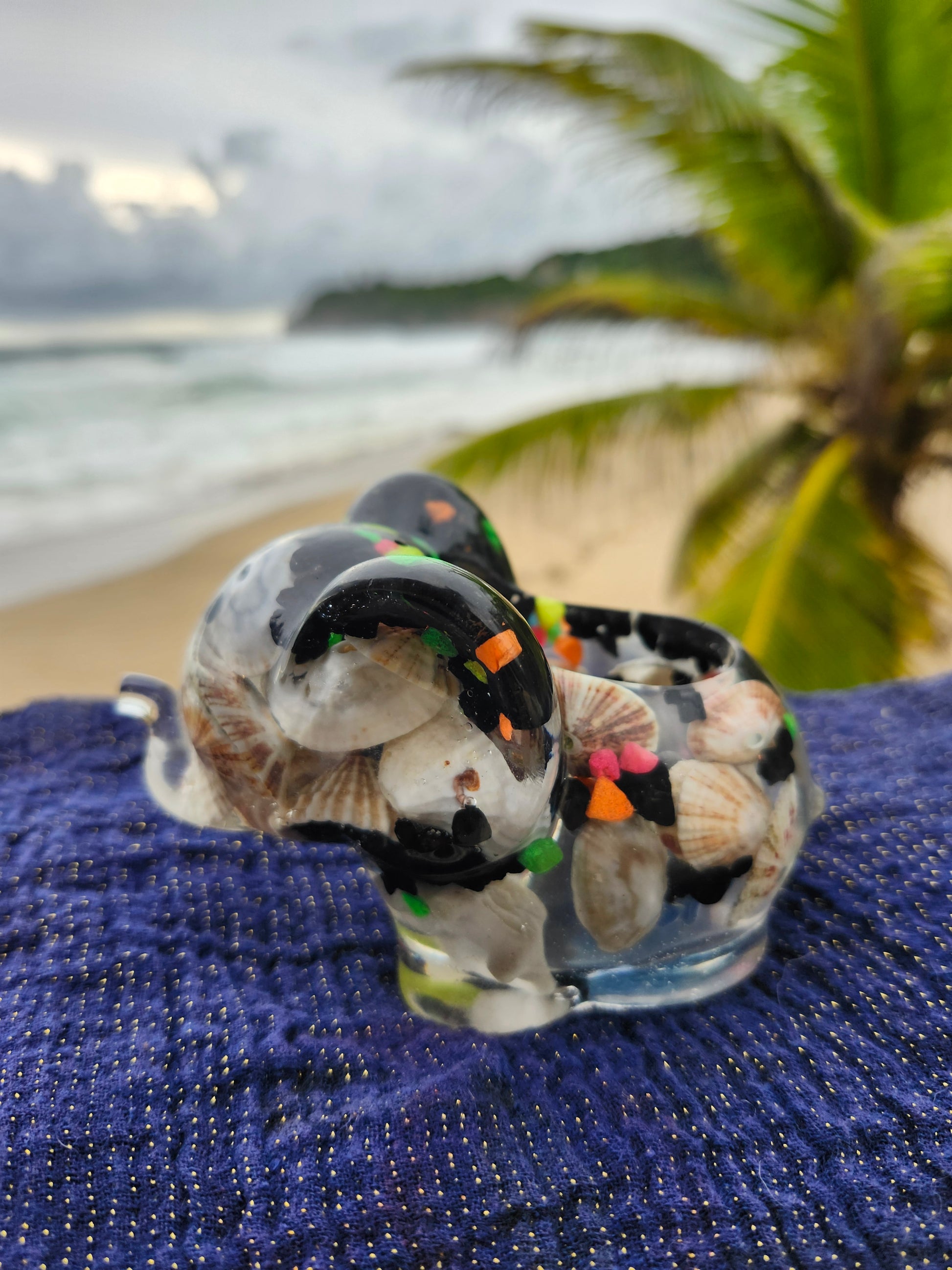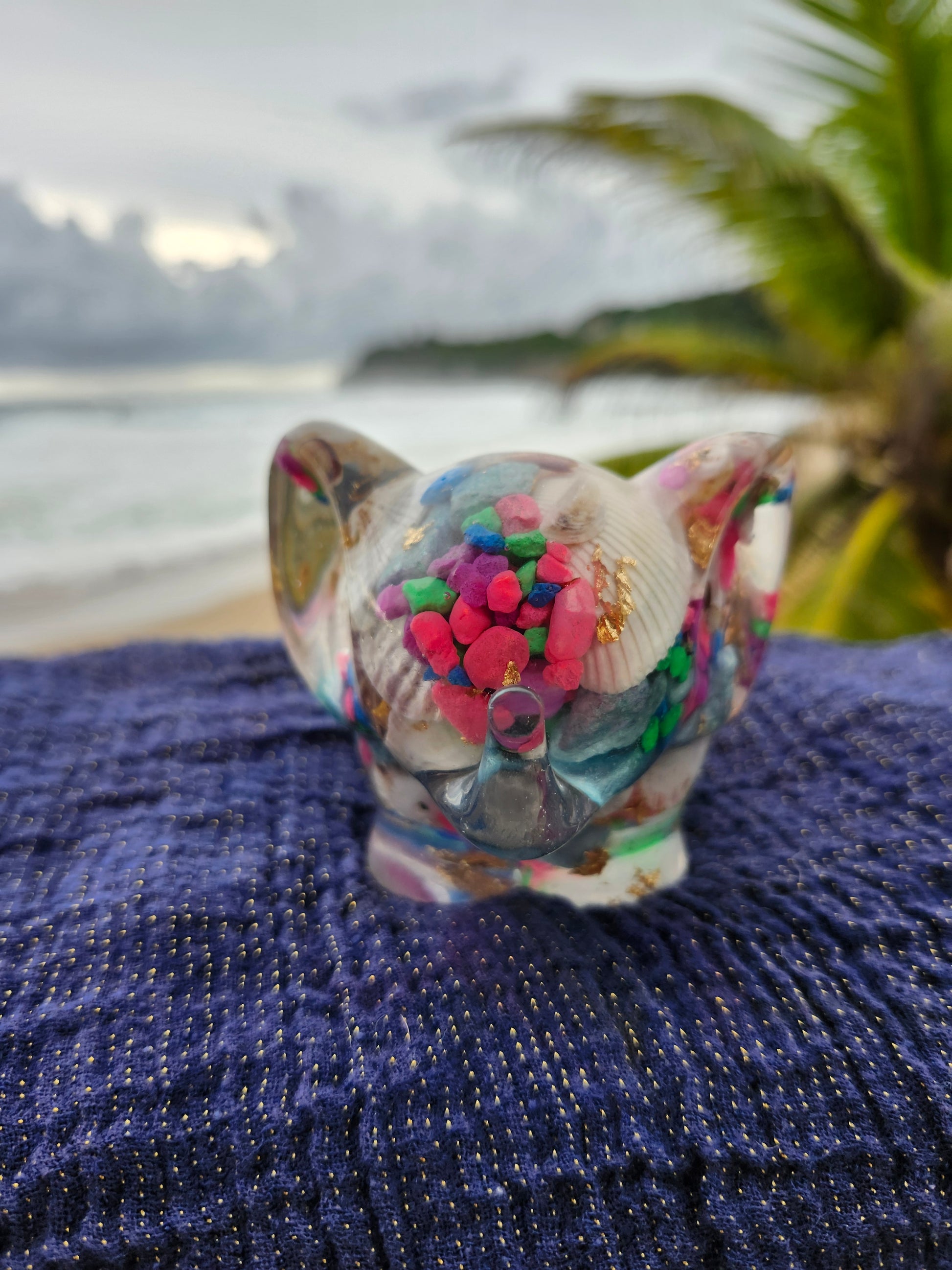 Elefante multiuso de resina: joyero, cenicero o candelabro. Pequeña obra de arte artesanal que captura la esencia de Puerto Rico. Cada pieza única está incrustada con arena de playa, micro-conchas o flores secas de la isla, creando un tesoro funcional con un toque del encanto boricua perfecto para tu hogar.