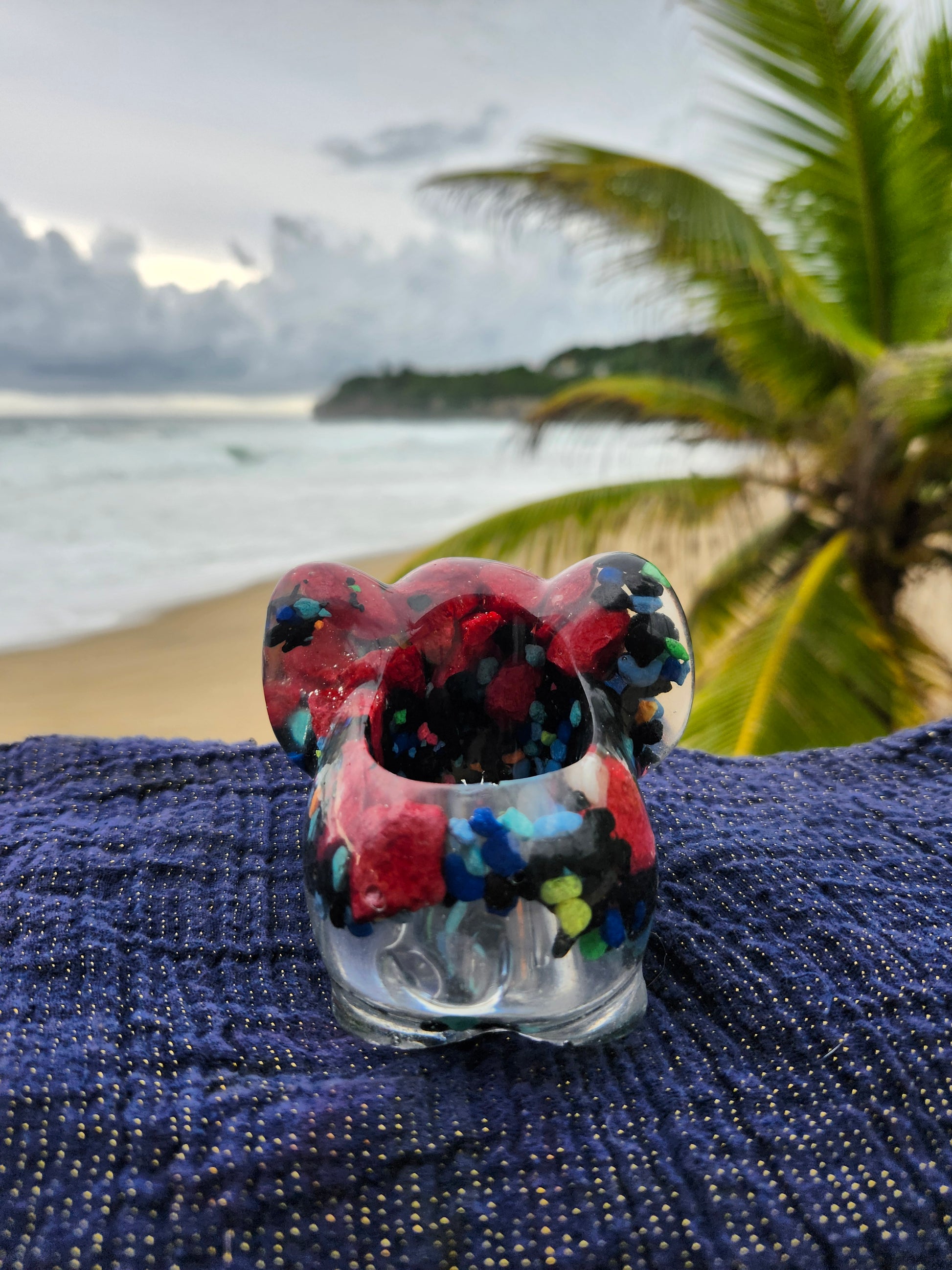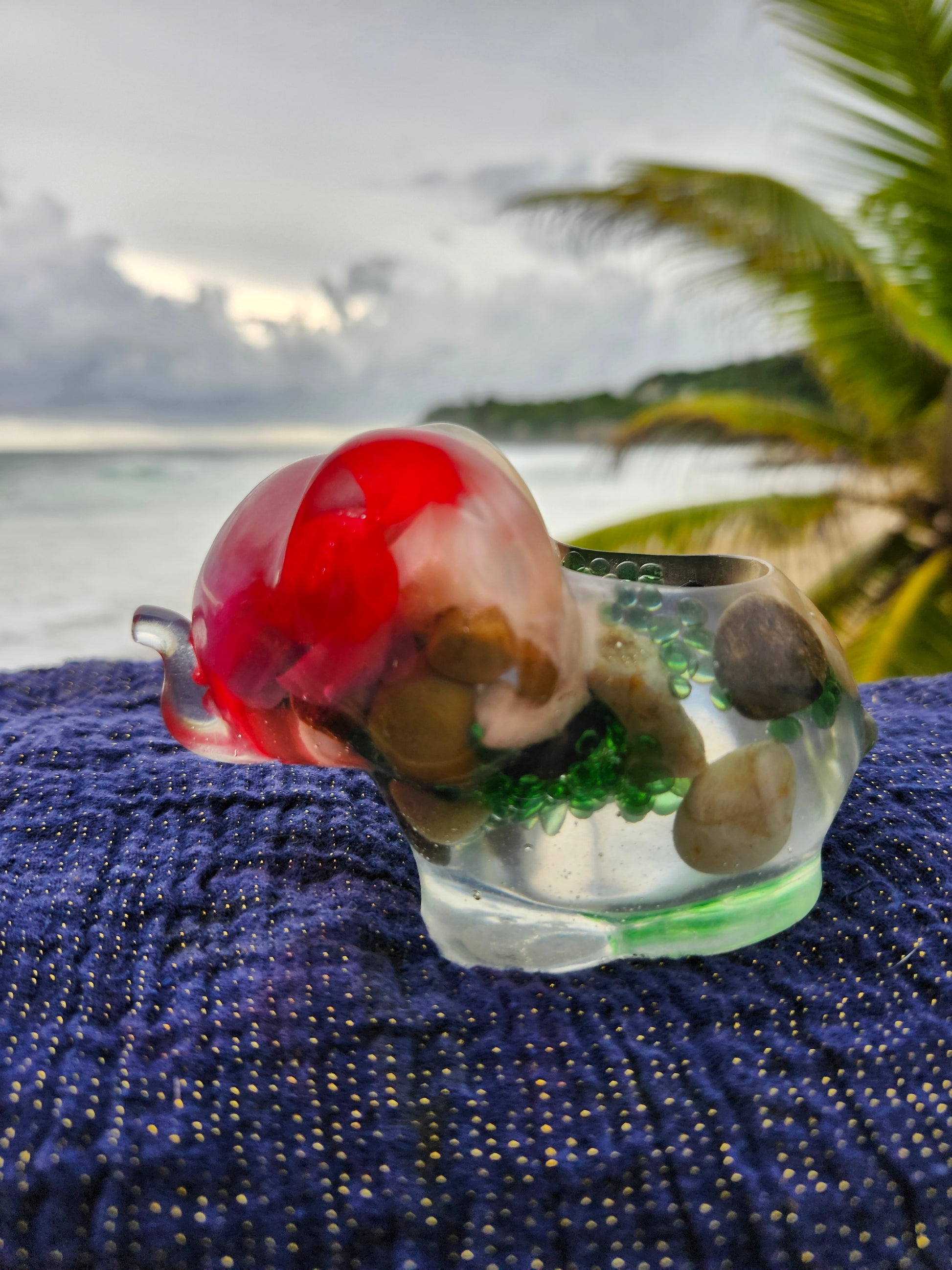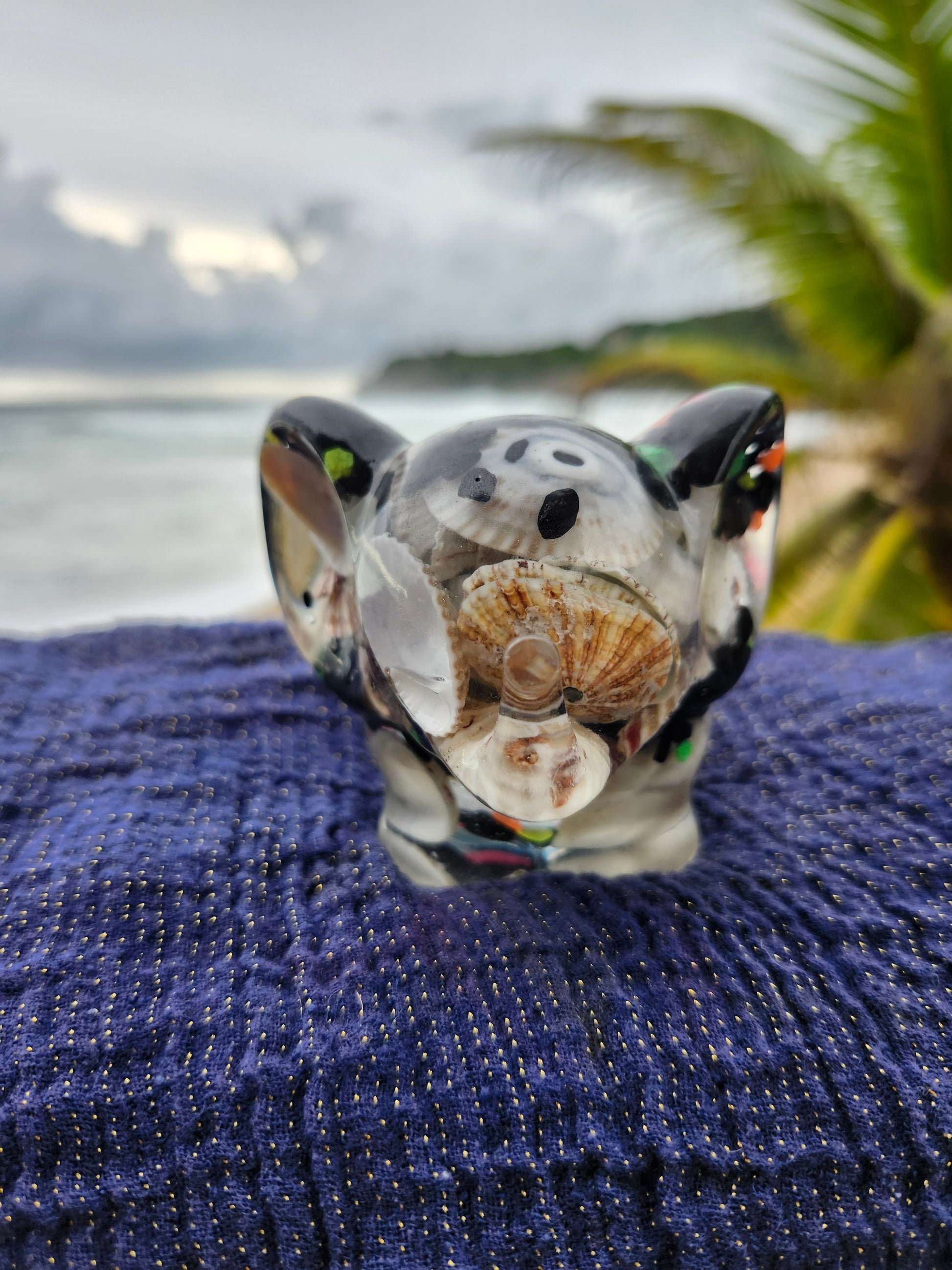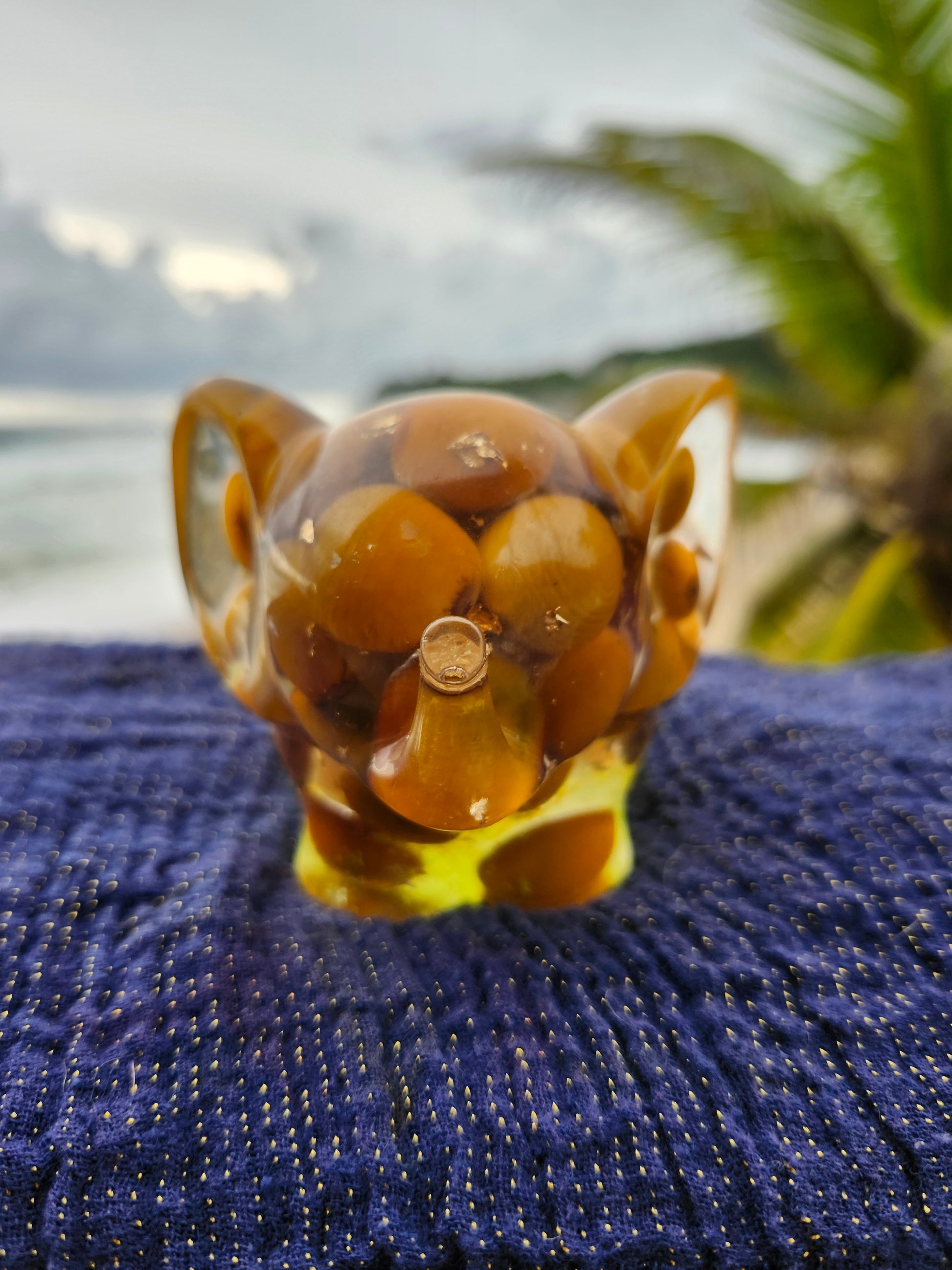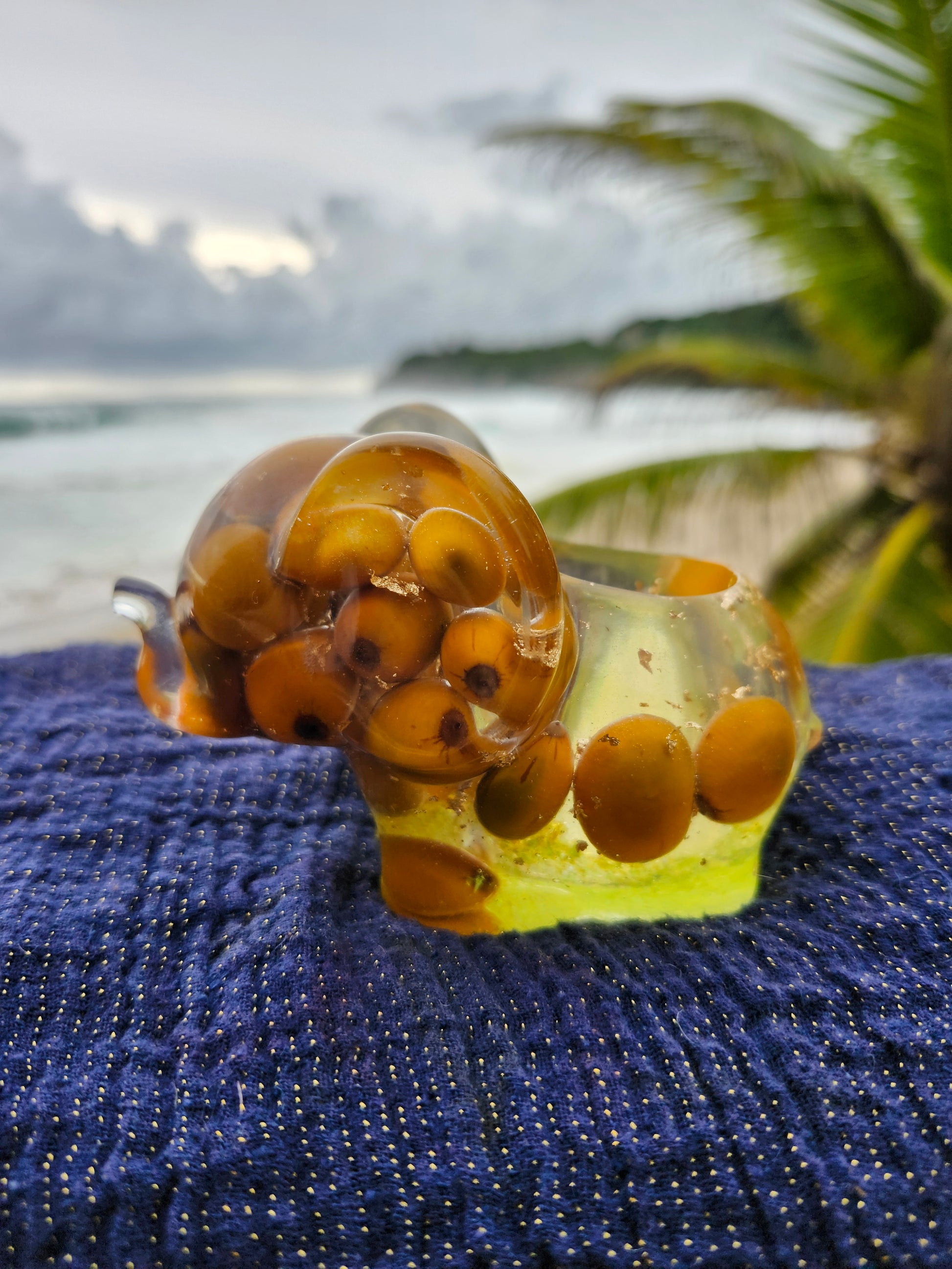 Elefante multiuso de resina: joyero, cenicero o candelabro. Pequeña obra de arte artesanal que captura la esencia de Puerto Rico. Cada pieza única está incrustada con arena de playa, micro-conchas o flores secas de la isla, creando un tesoro funcional con un toque del encanto boricua perfecto para tu hogar.