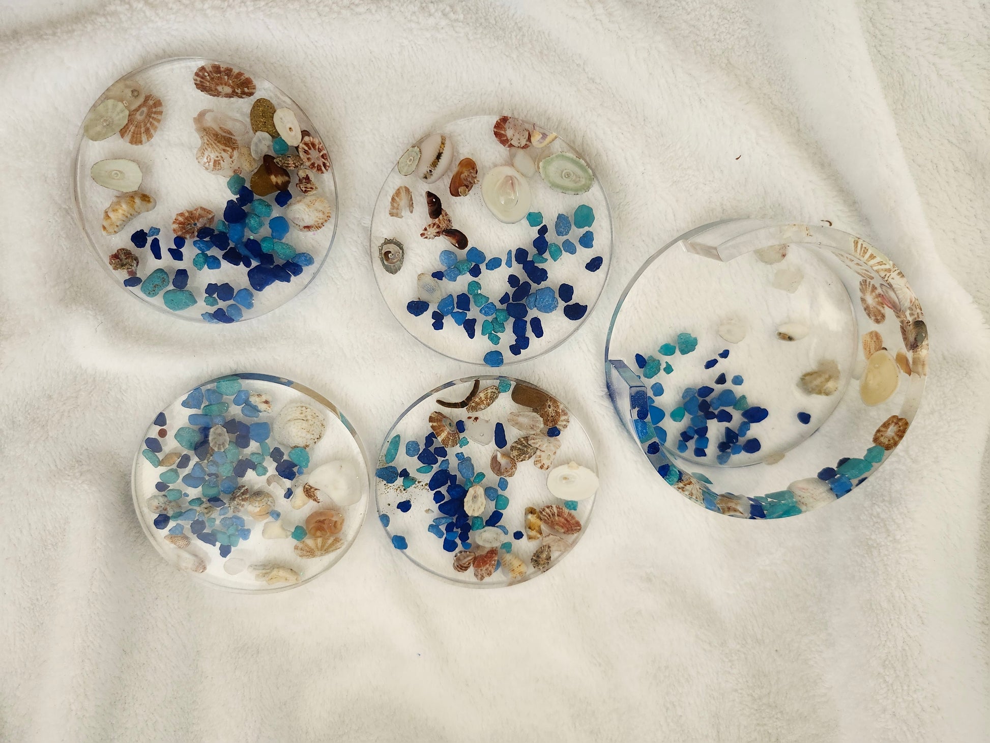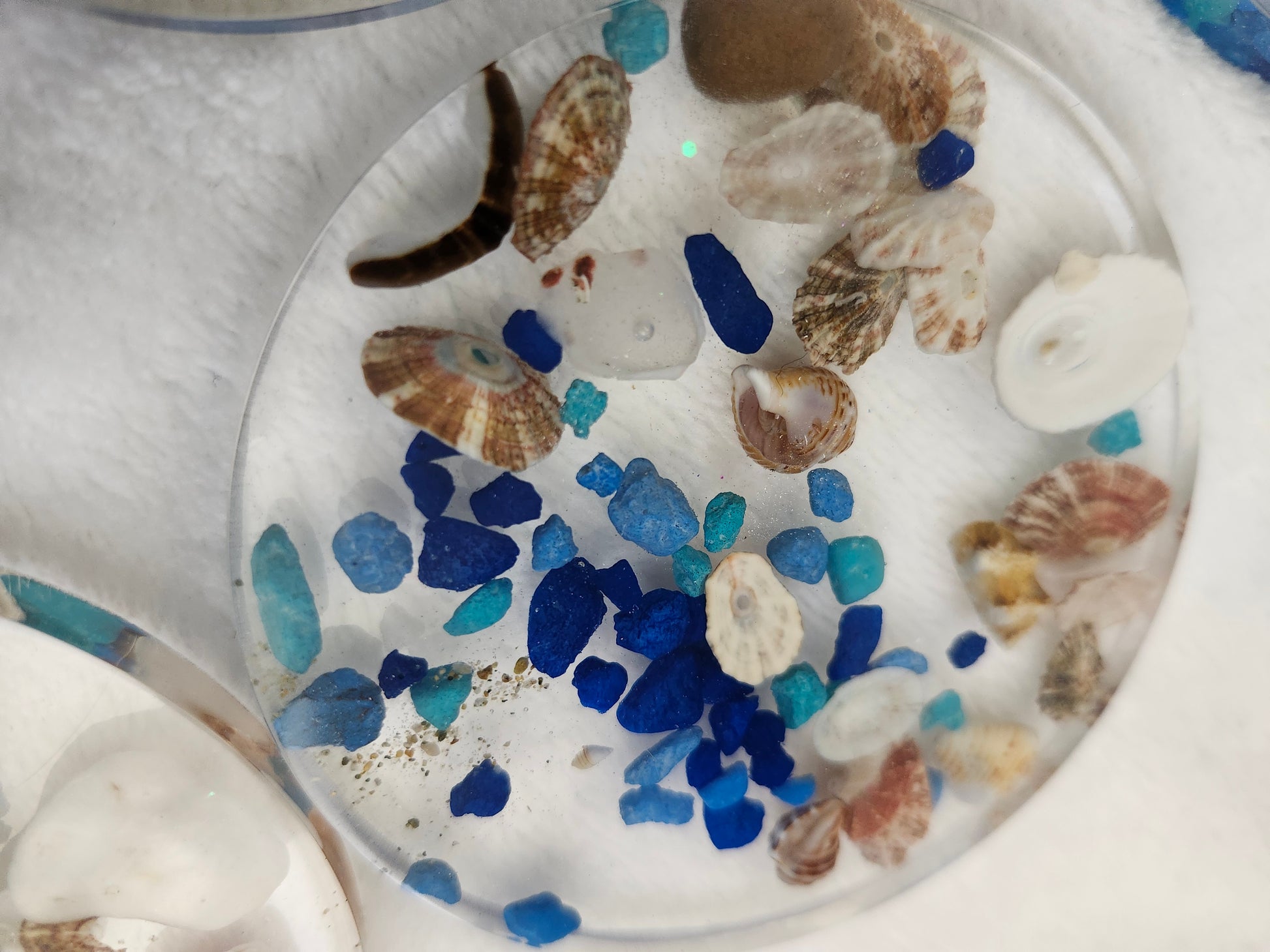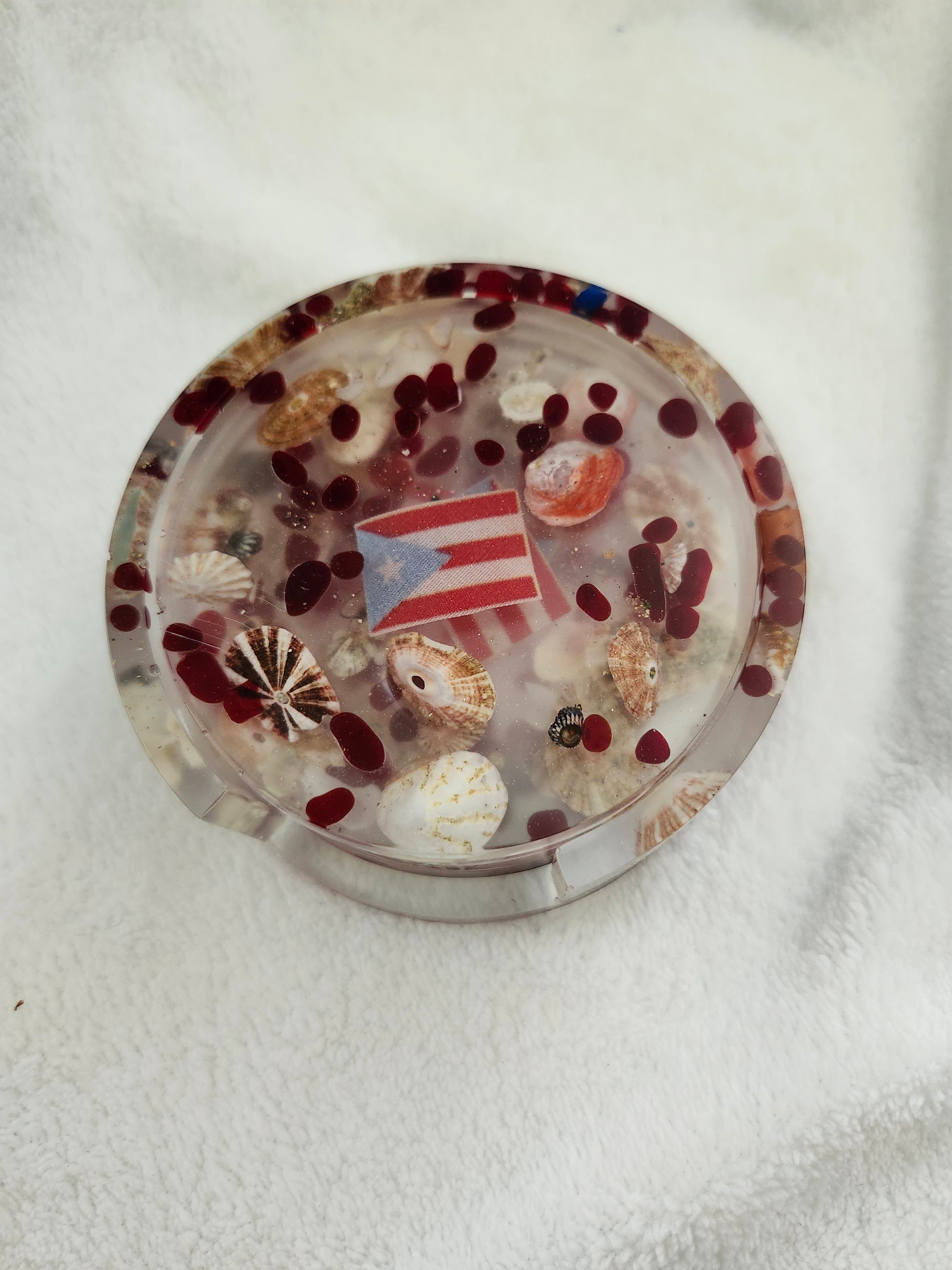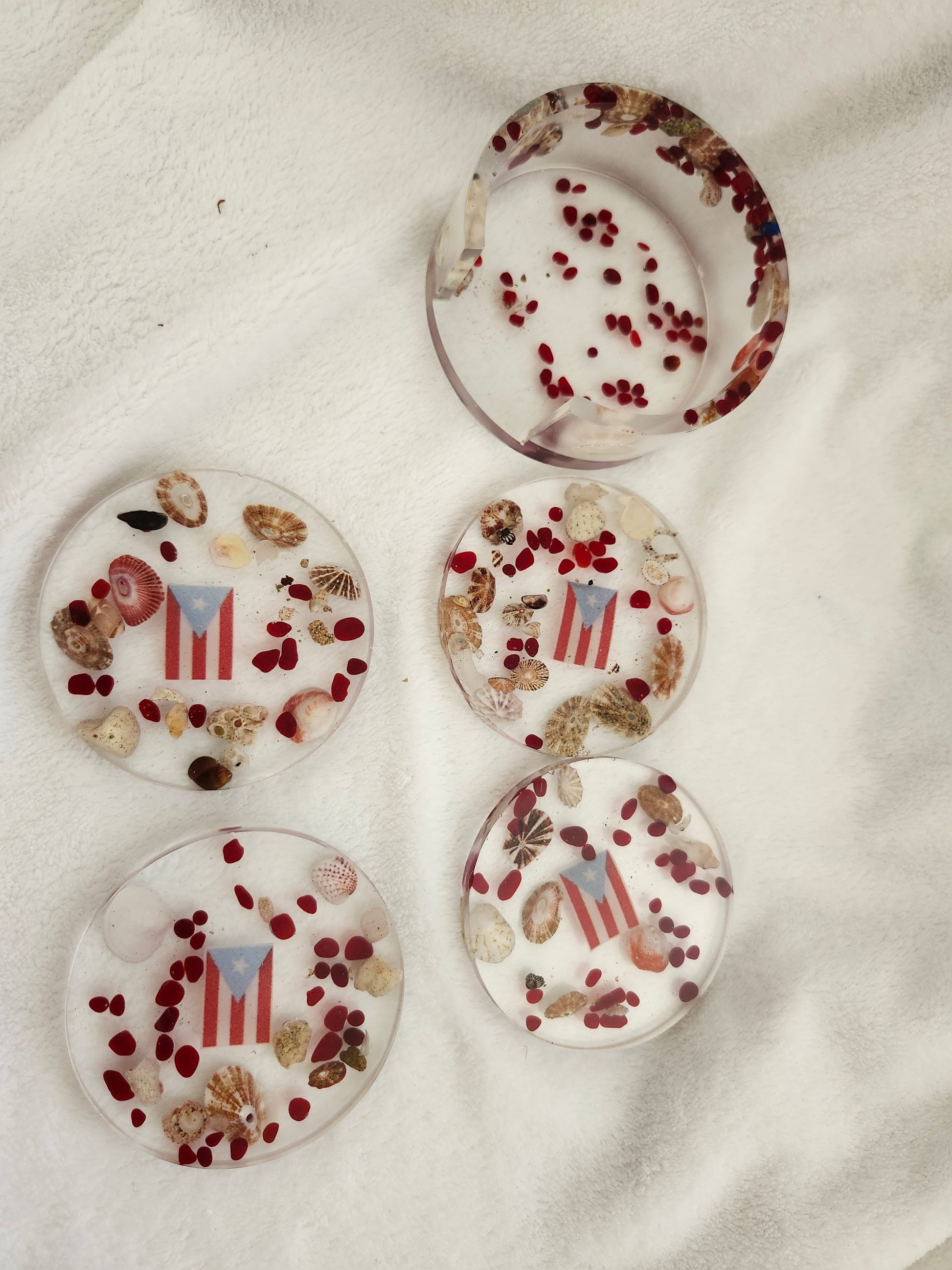 Set de portavasos de resina elaborado a mano con arena y caracoles de las playas de Puerto Rico. Incluye 4 portavasos y base a juego, combinando funcionalidad y arte costero. Cada pieza es única, resistente y decorativa, ideal para resaltar tu mesa con un toque tropical y caribeño.