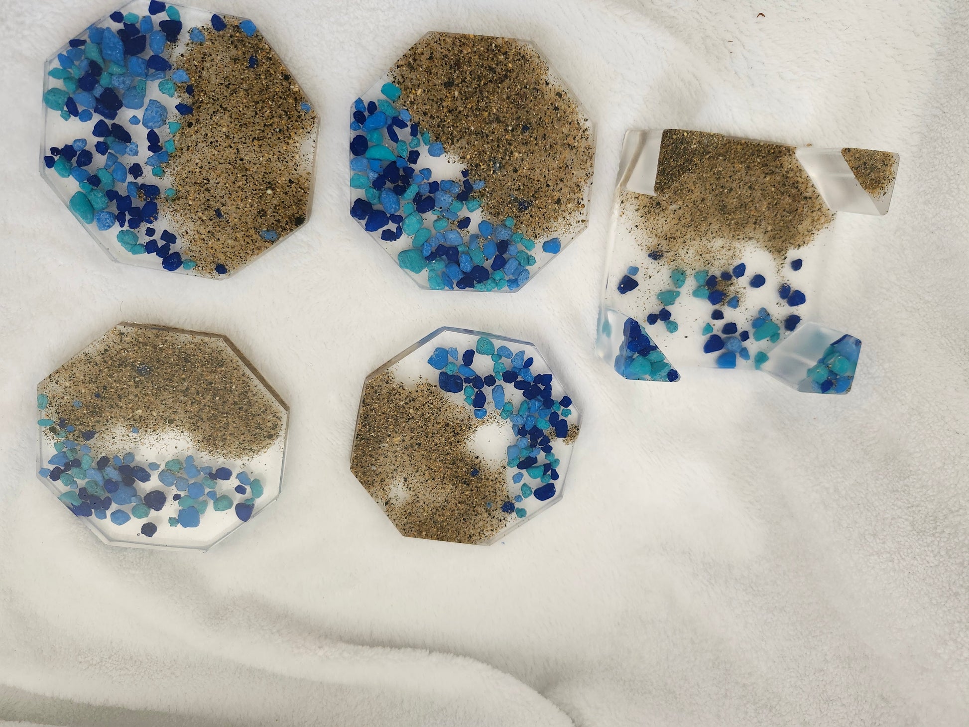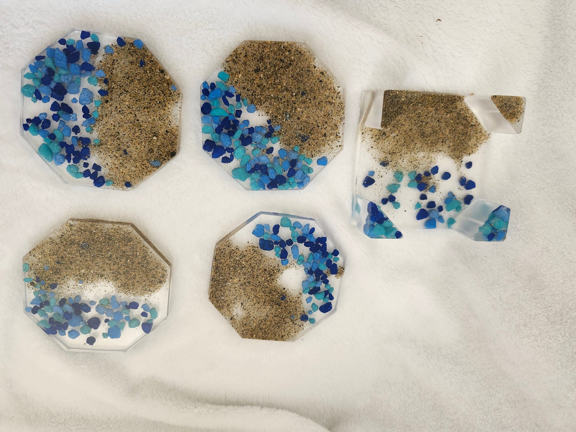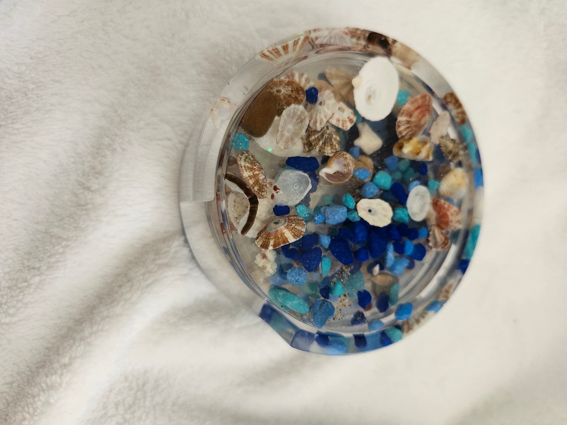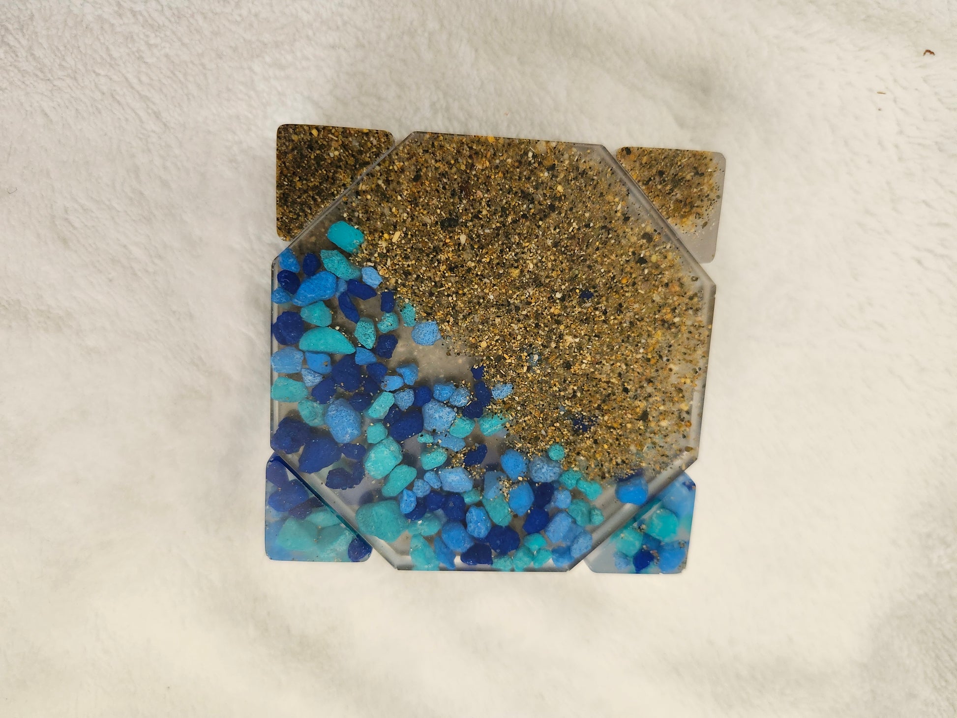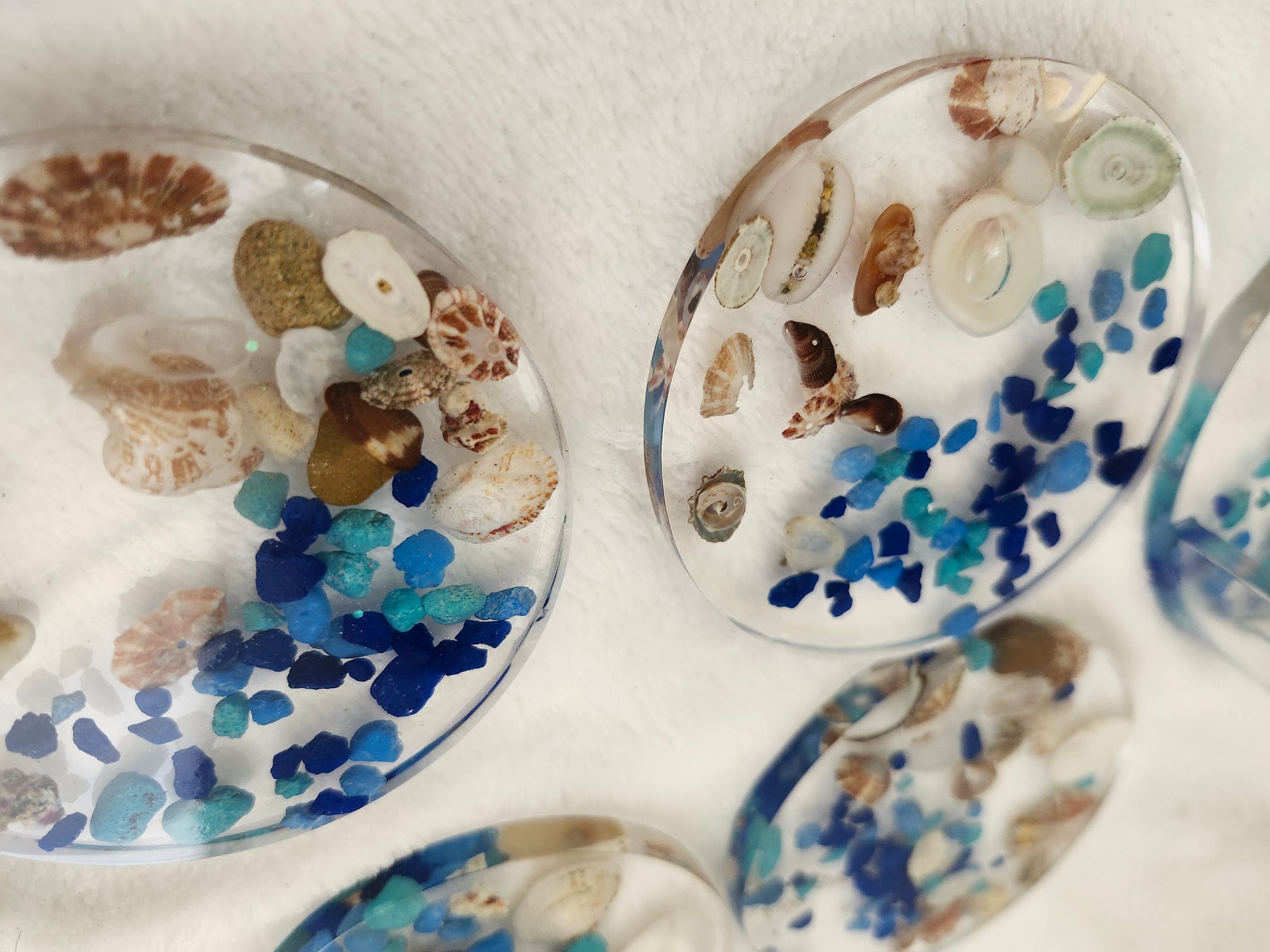 Set de portavasos de resina elaborado a mano con arena y caracoles de las playas de Puerto Rico. Incluye 4 portavasos y base a juego, combinando funcionalidad y arte costero. Cada pieza es única, resistente y decorativa, ideal para resaltar tu mesa con un toque tropical y caribeño.