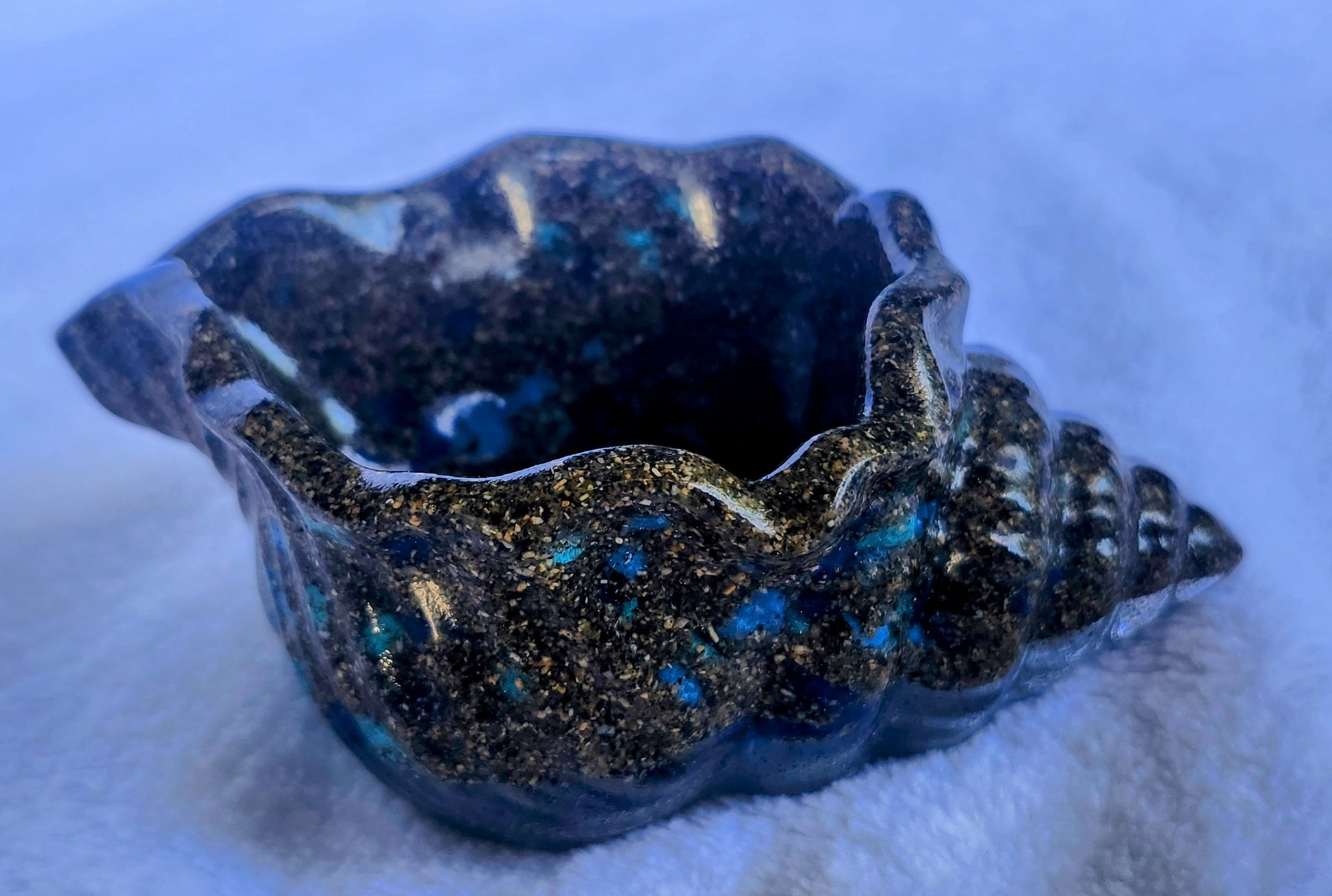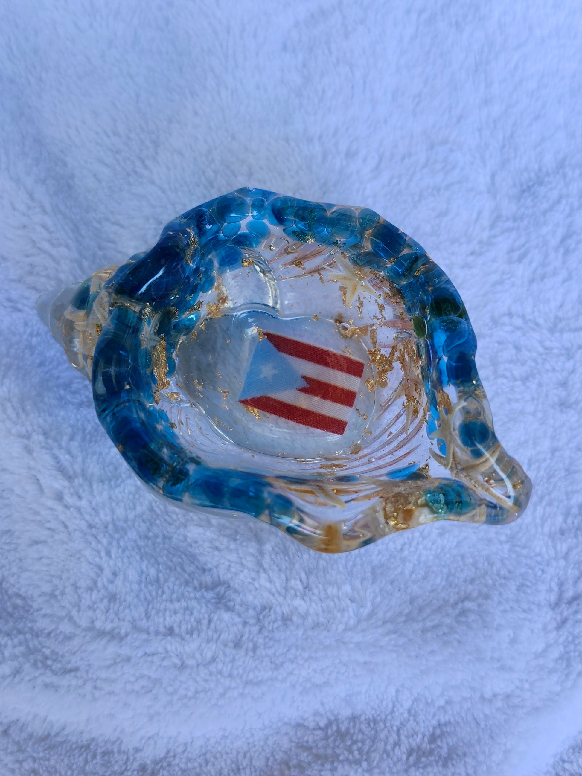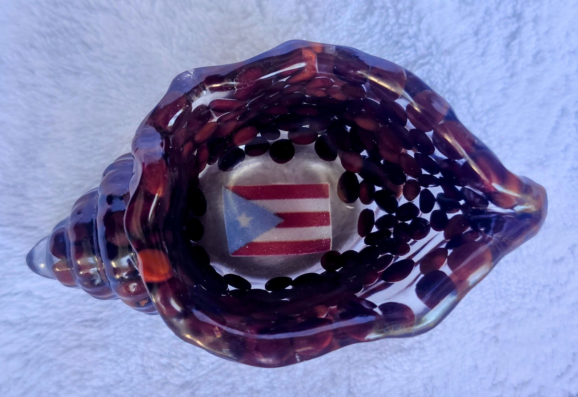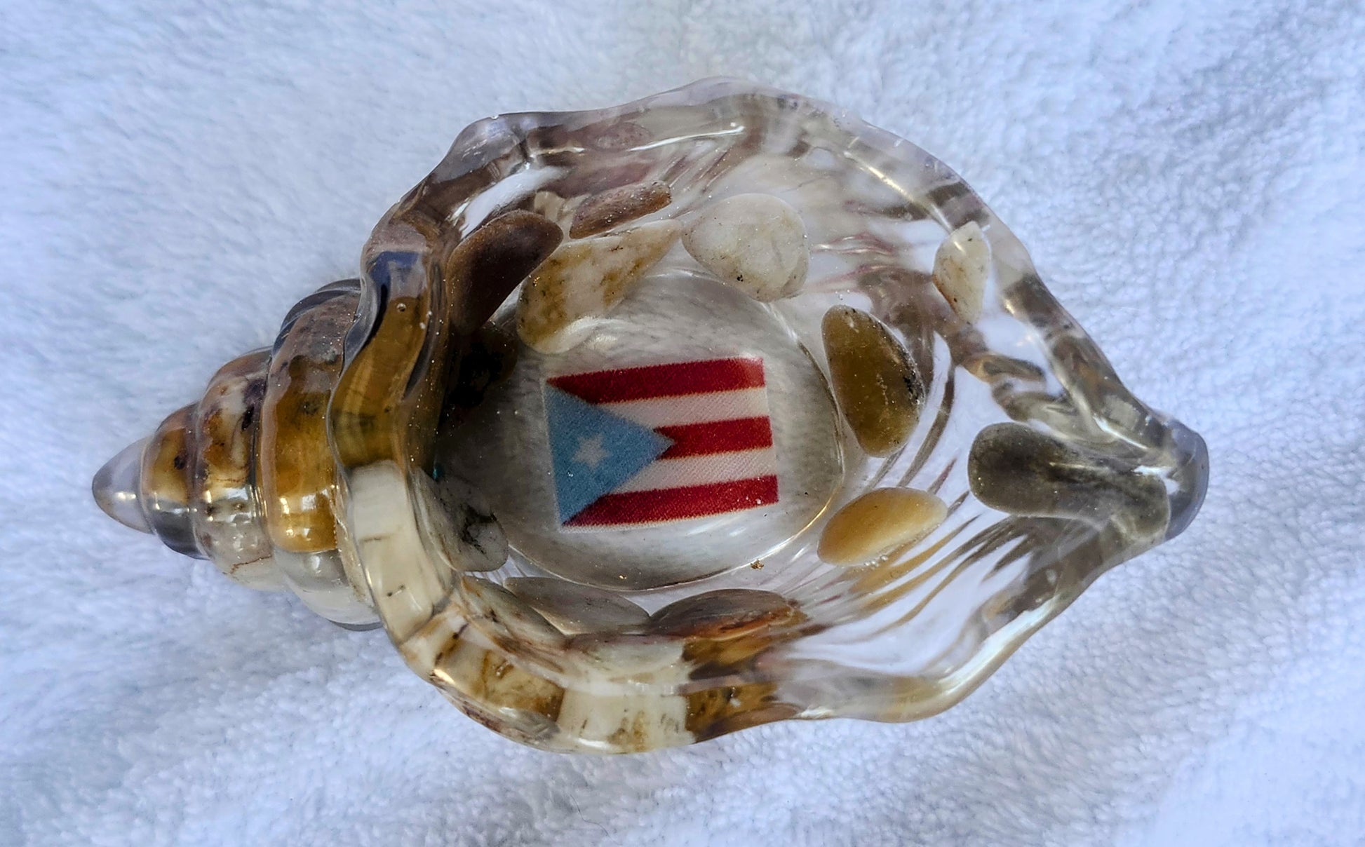 Caracol multiuso de resina: joyero, cenicero o candelabro. Pequeña obra de arte artesanal que captura la esencia de Puerto Rico. Cada pieza única está incrustada con arena de playa, micro-conchas, piedras, cristales o flores secas de la isla, creando un tesoro funcional con un toque del encanto boricua perfecto para tu hogar.