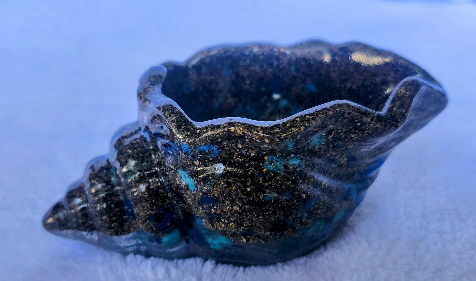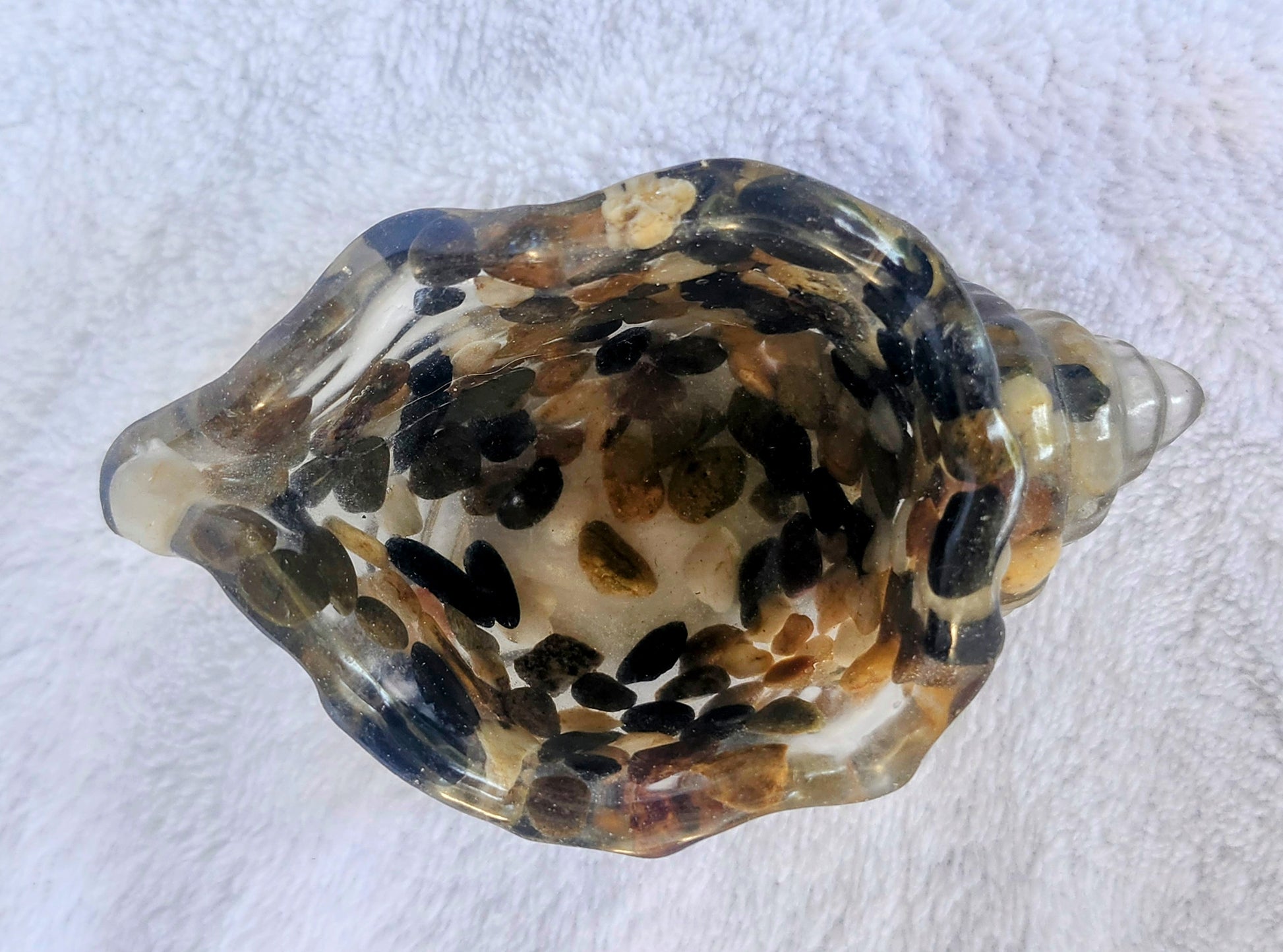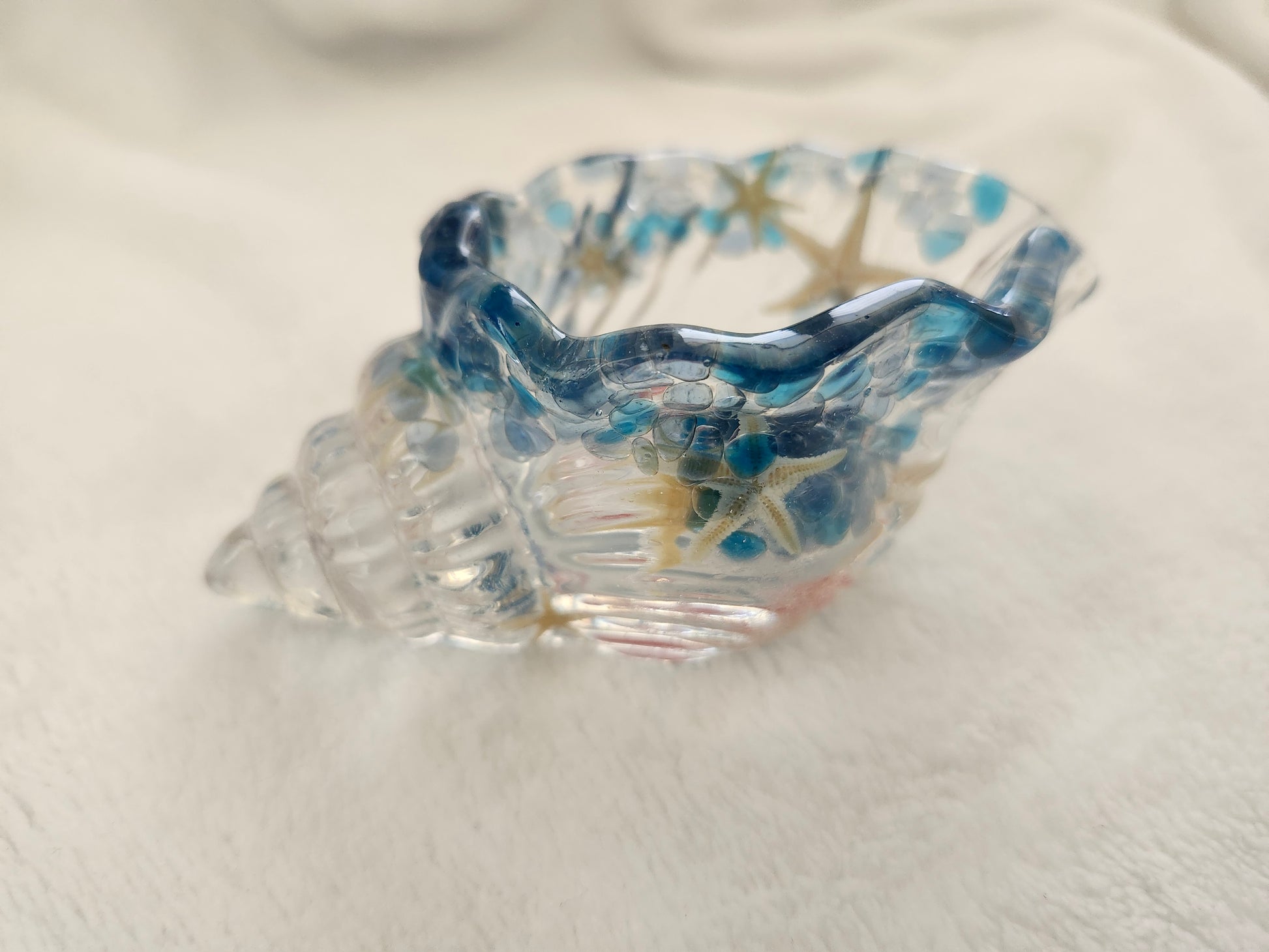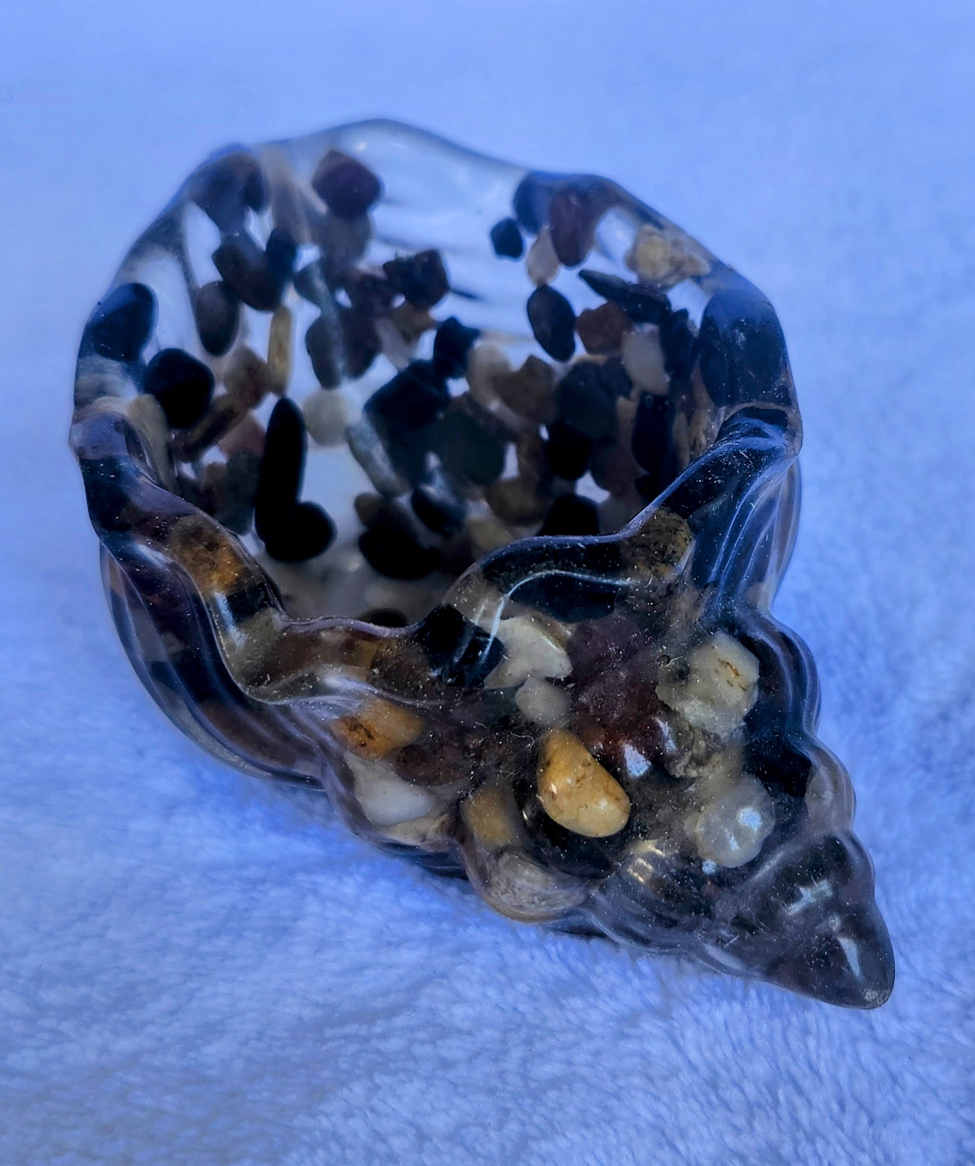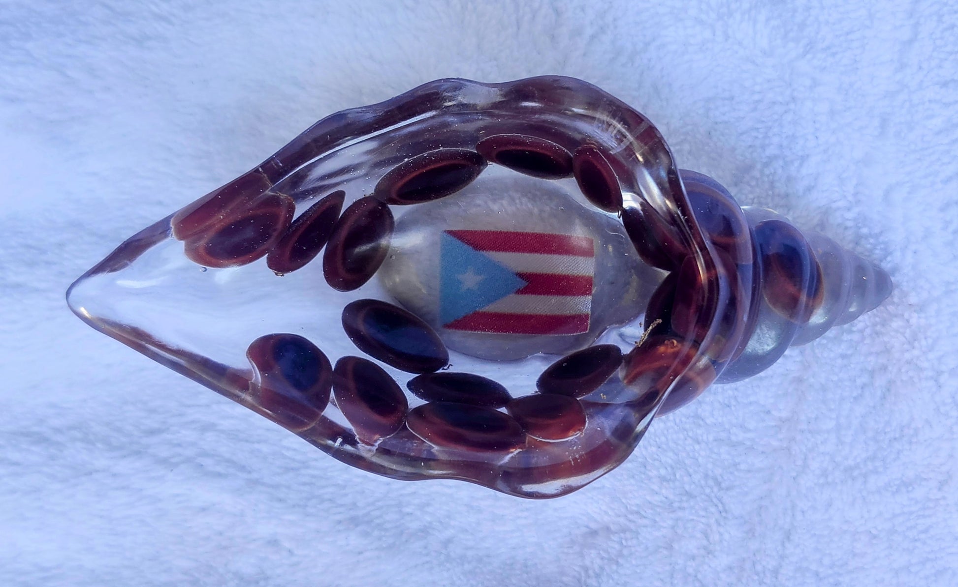 Caracol multiuso de resina: joyero, cenicero o candelabro. Pequeña obra de arte artesanal que captura la esencia de Puerto Rico. Cada pieza única está incrustada con arena de playa, micro-conchas, piedras, cristales o flores secas de la isla, creando un tesoro funcional con un toque del encanto boricua perfecto para tu hogar.