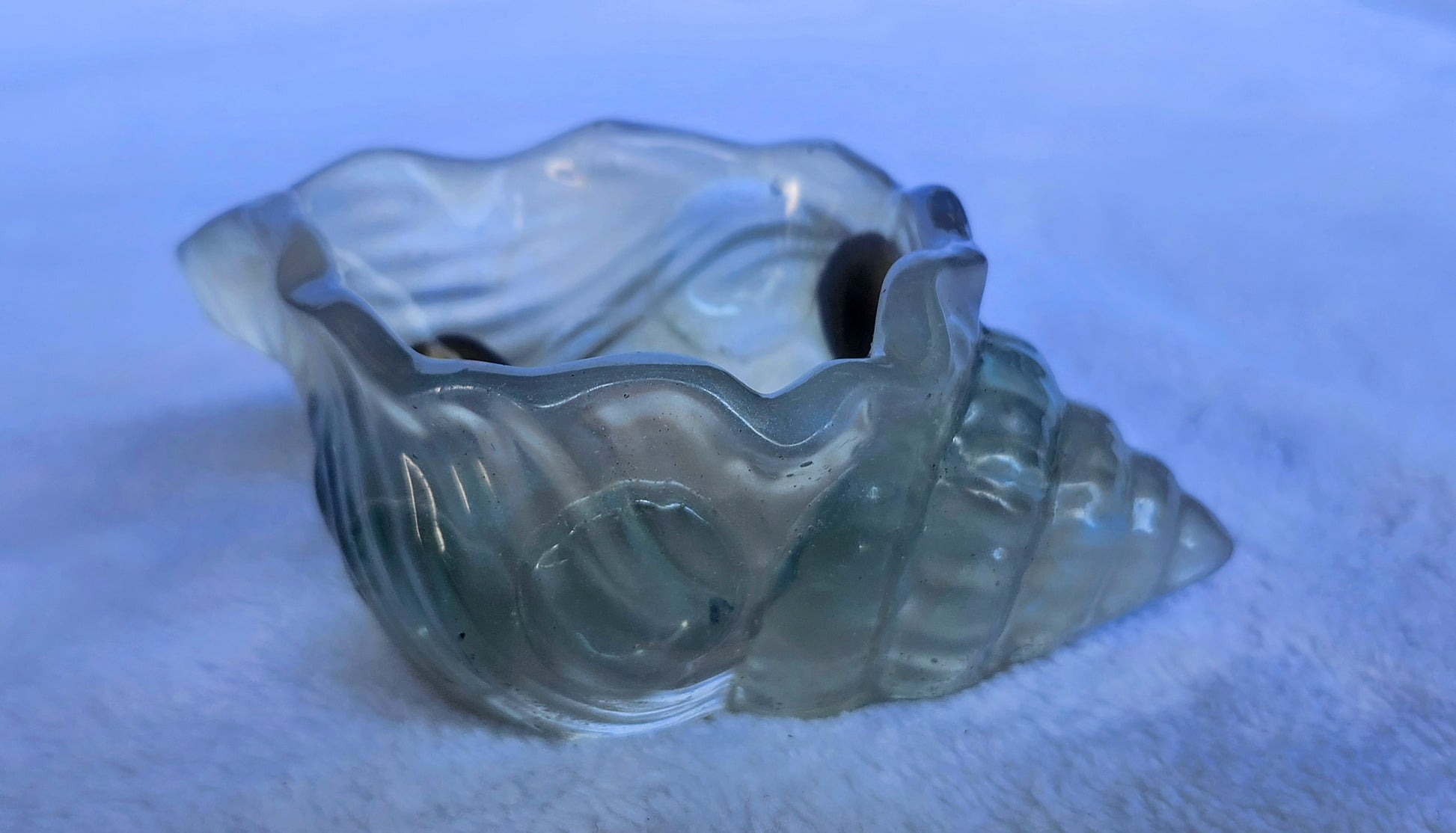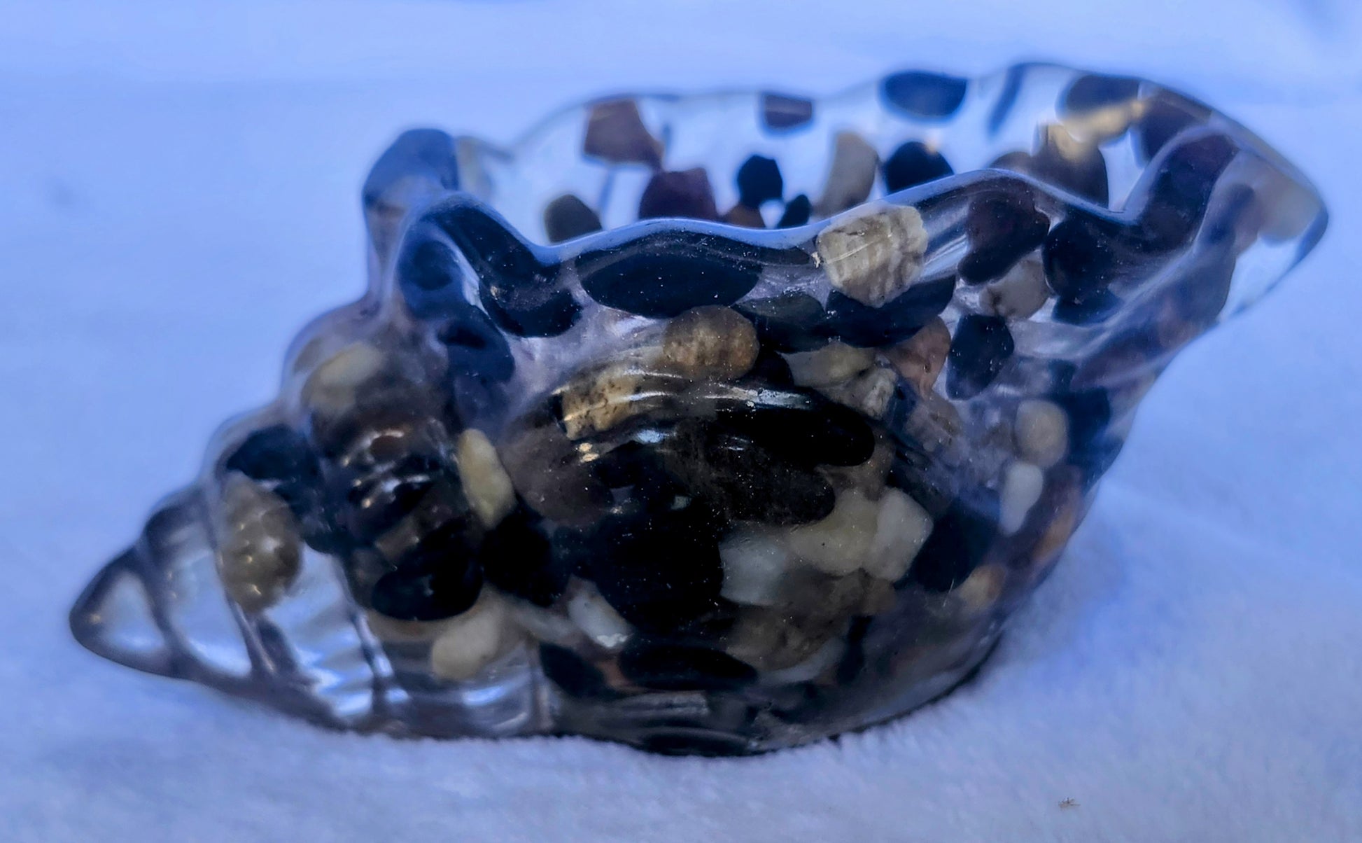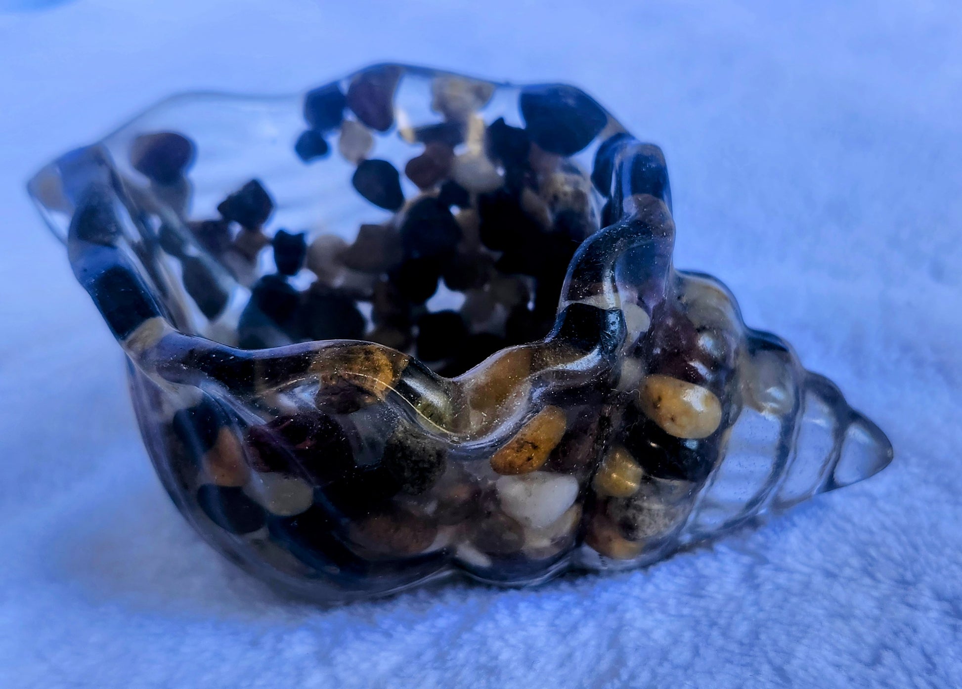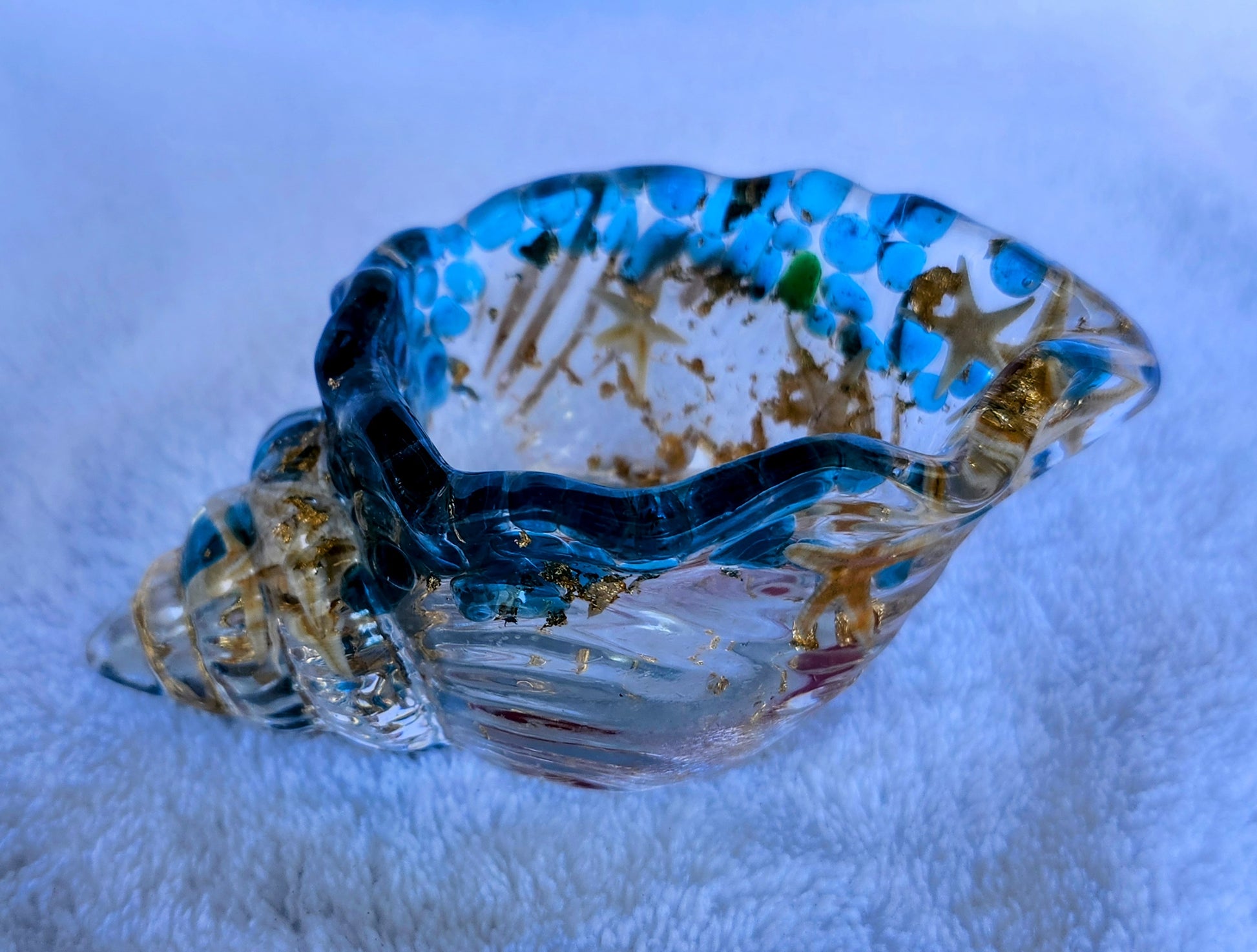 Caracol multiuso de resina: joyero, cenicero o candelabro. Pequeña obra de arte artesanal que captura la esencia de Puerto Rico. Cada pieza única está incrustada con arena de playa, micro-conchas, piedras, cristales o flores secas de la isla, creando un tesoro funcional con un toque del encanto boricua perfecto para tu hogar.