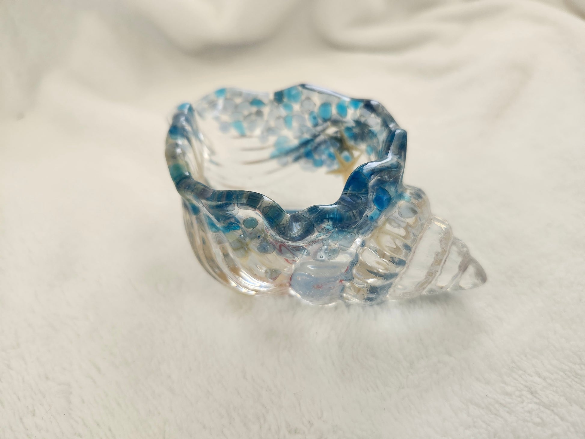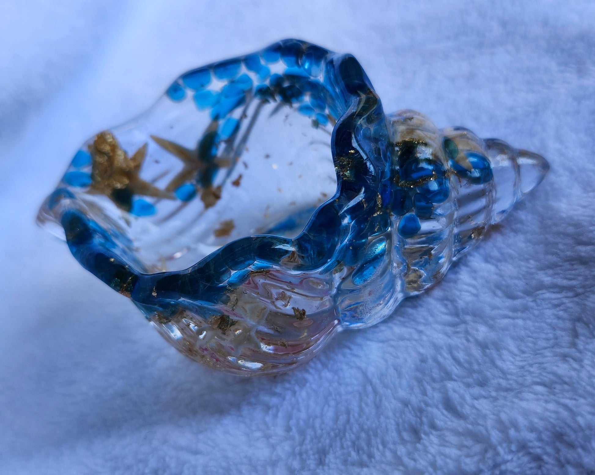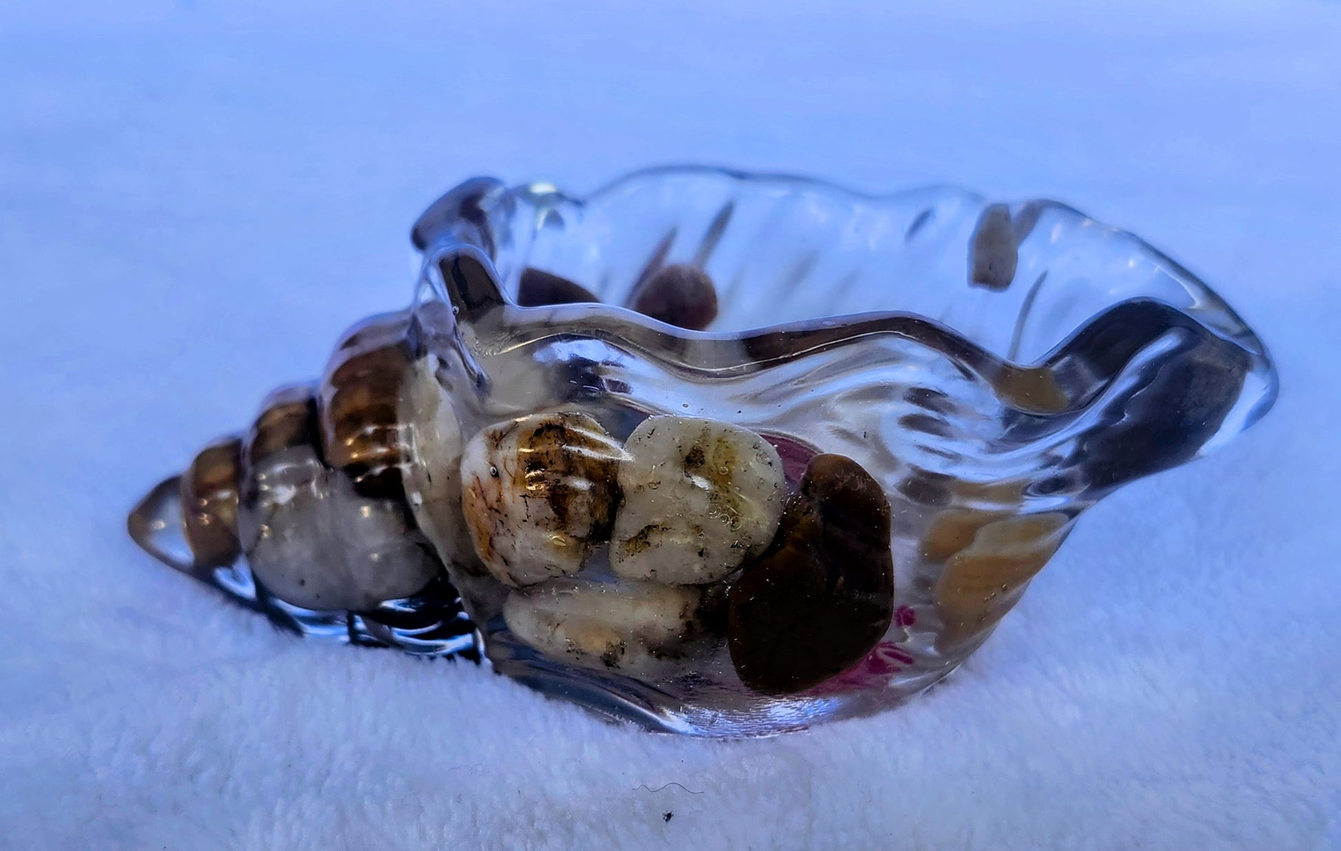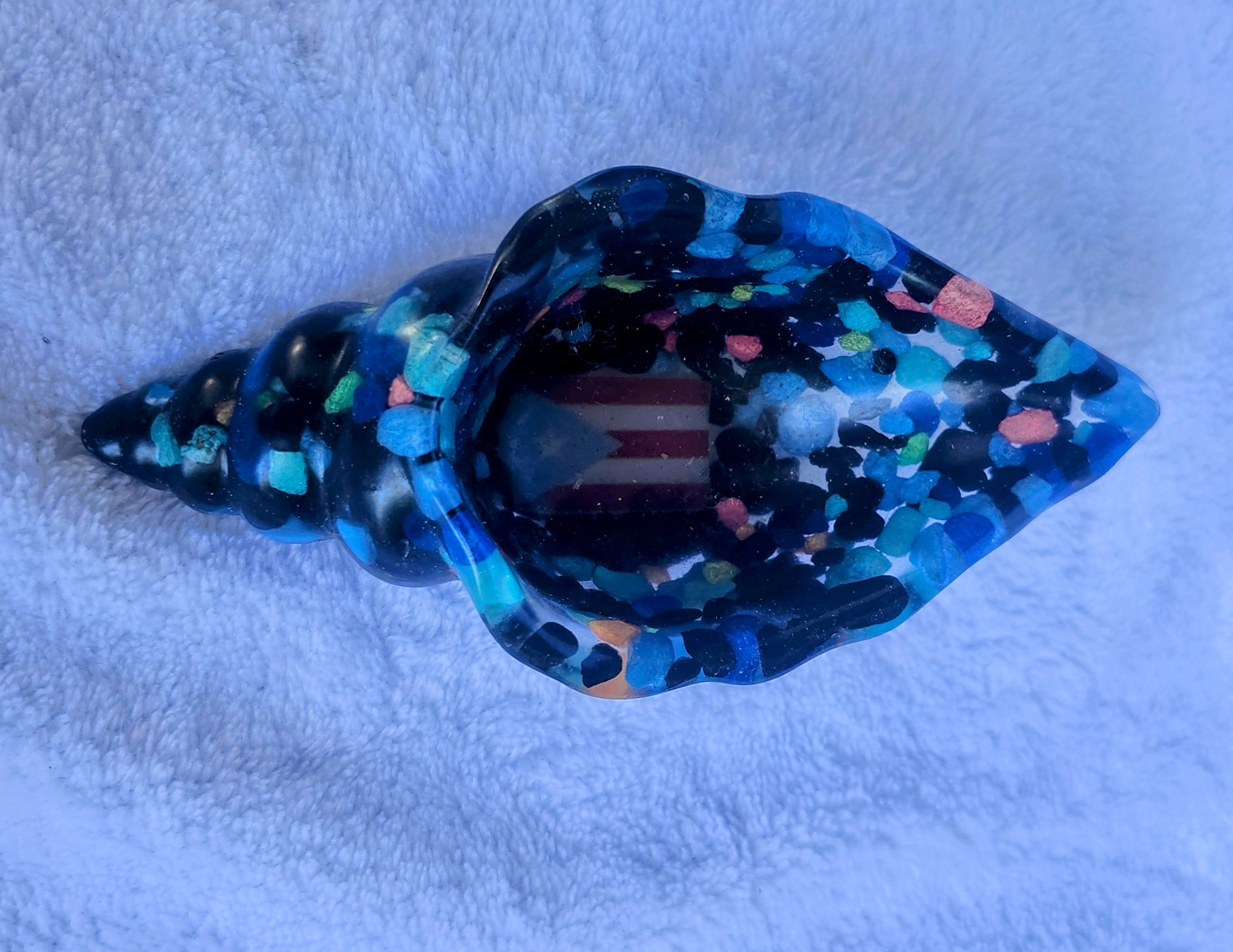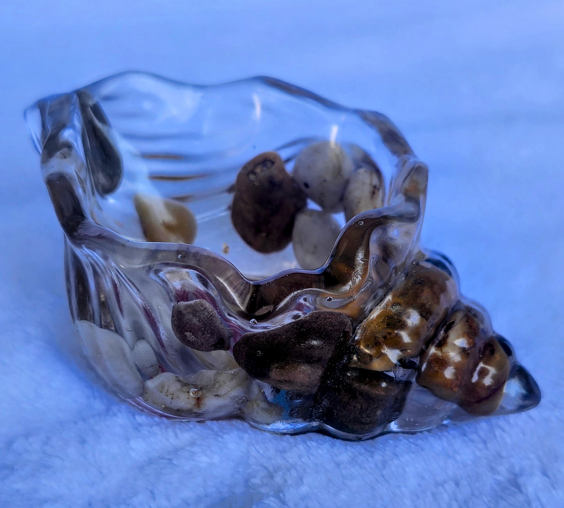 Caracol multiuso de resina: joyero, cenicero o candelabro. Pequeña obra de arte artesanal que captura la esencia de Puerto Rico. Cada pieza única está incrustada con arena de playa, micro-conchas, piedras, cristales o flores secas de la isla, creando un tesoro funcional con un toque del encanto boricua perfecto para tu hogar.
